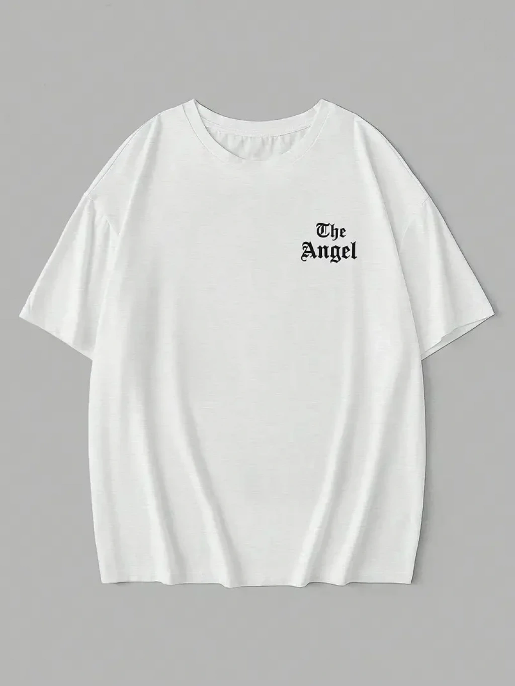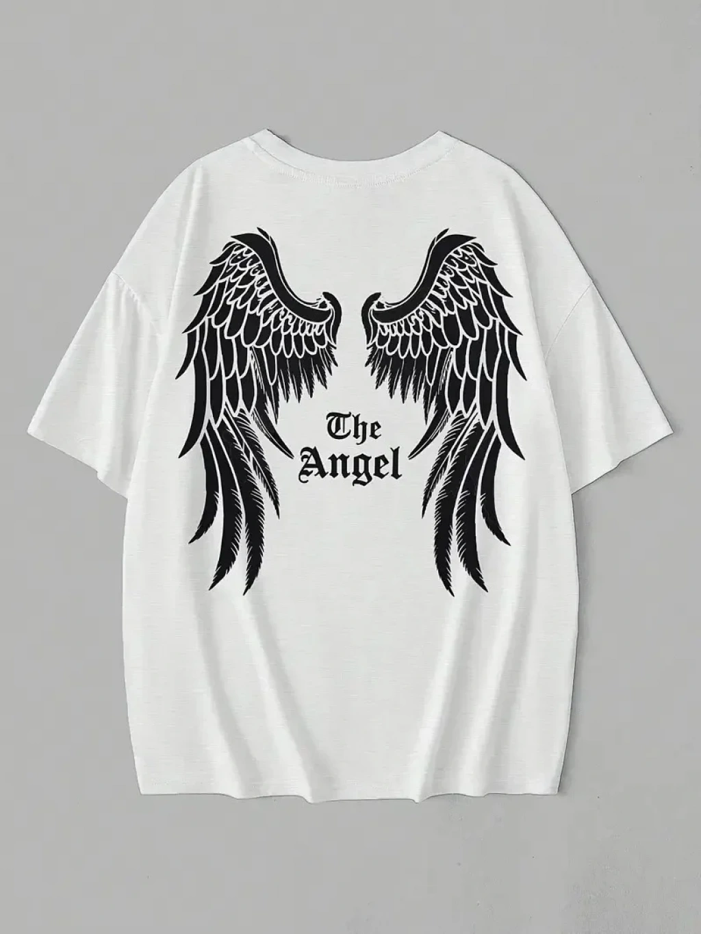 20/1 Penye Compack Dark Angel Baskılı Oversize Kısa Kol Yazlık T-shirt- Beyaz