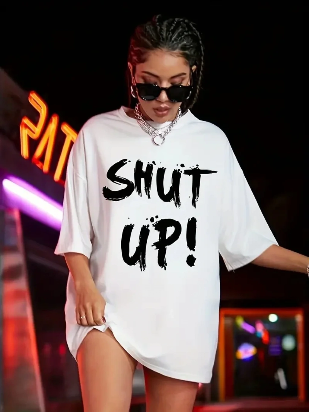 20/1 Penye Compack Oversize Beyaz Shut Up Kısa Kol Yazlık Tişört - Beyaz