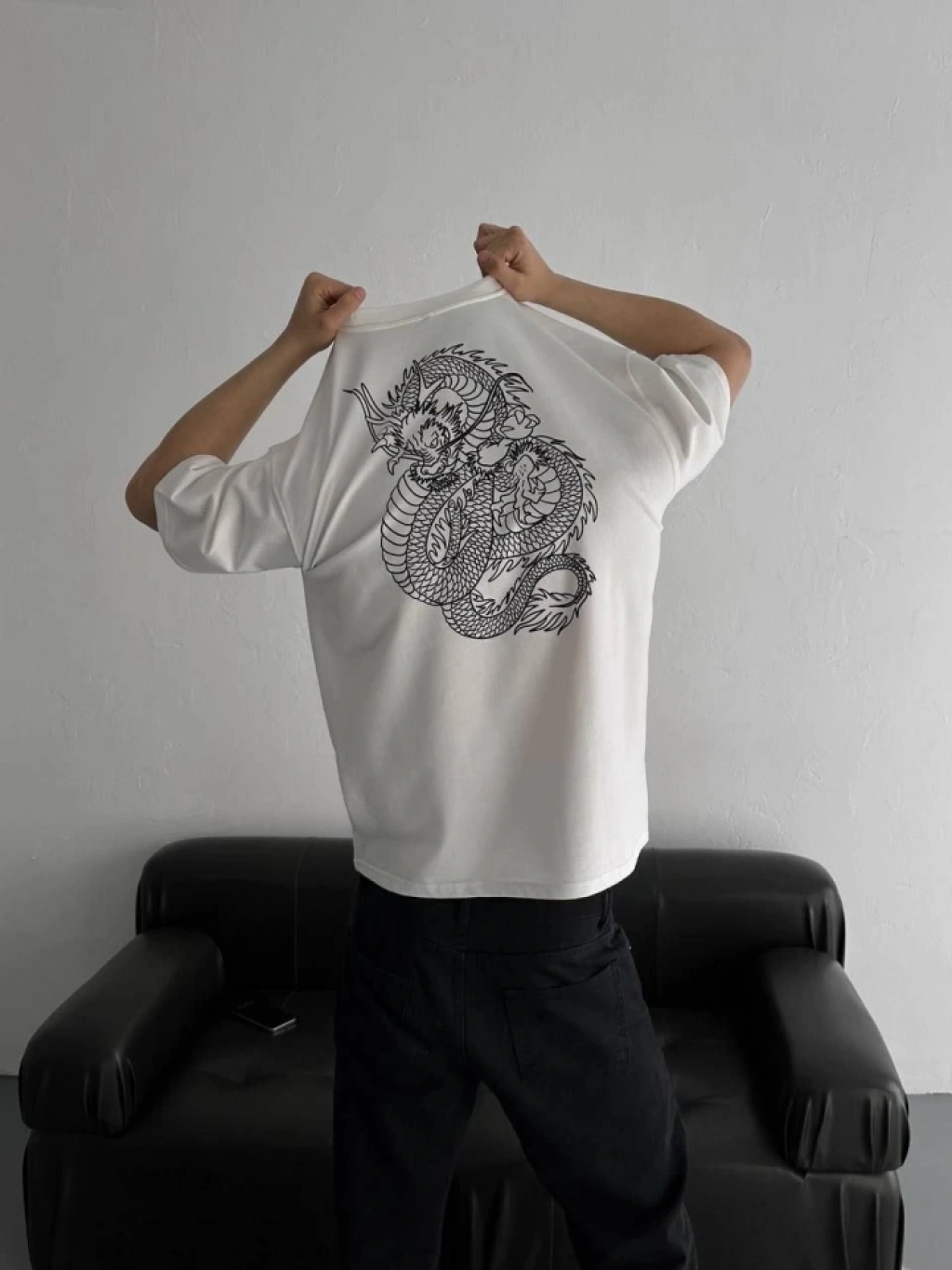 Baskılı Oversize Bisiklet Yaka T-shirt - Beyaz