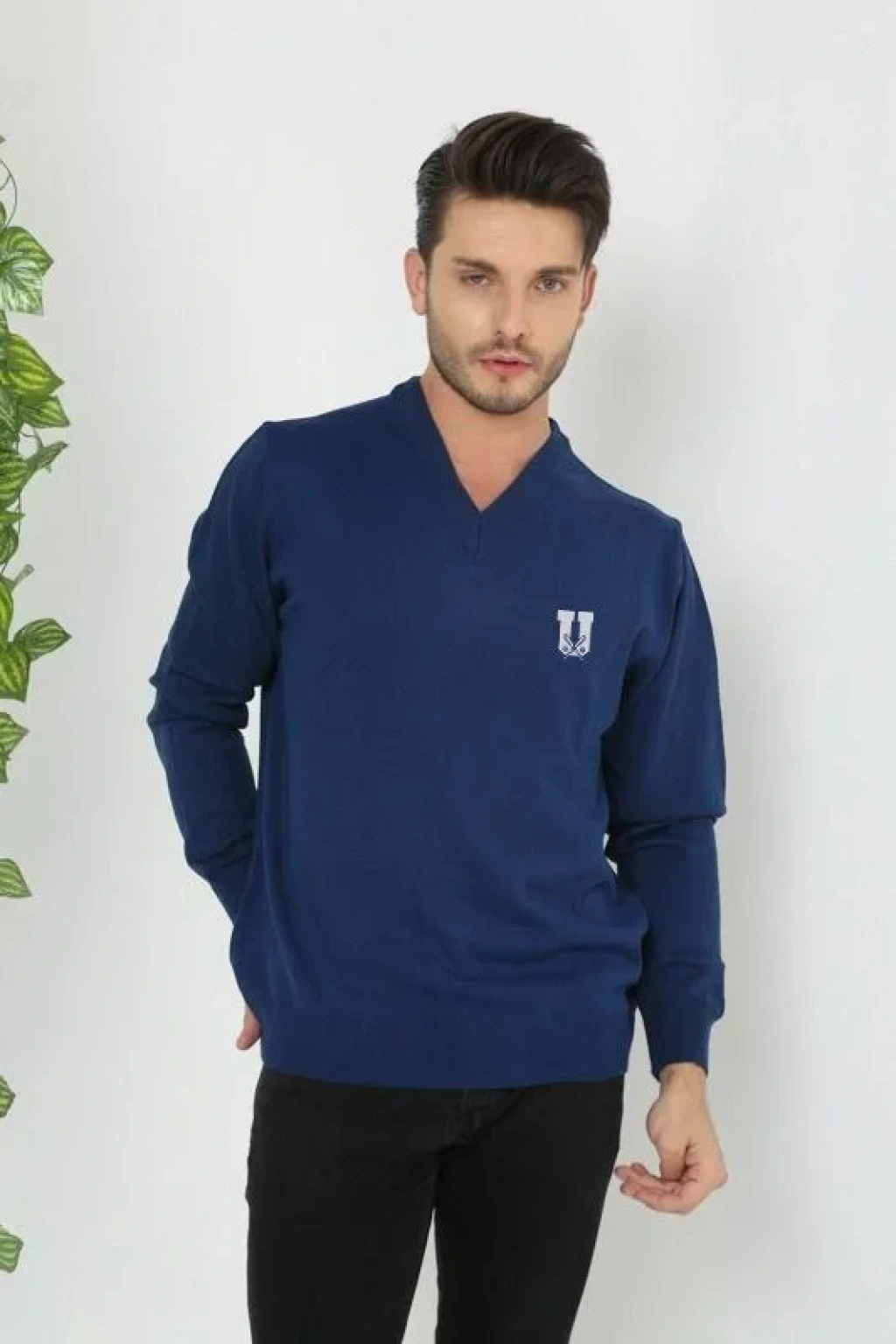 Baskılı V Yaka Uzun Kol Dokuma Triko - Indigo