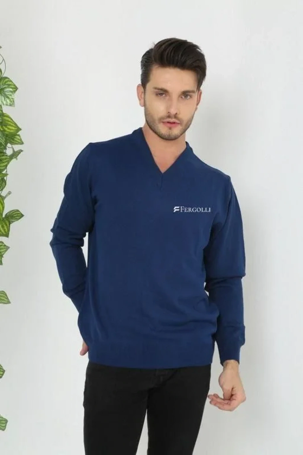 Baskılı V Yaka Uzun Kol Dokuma Triko - Indigo