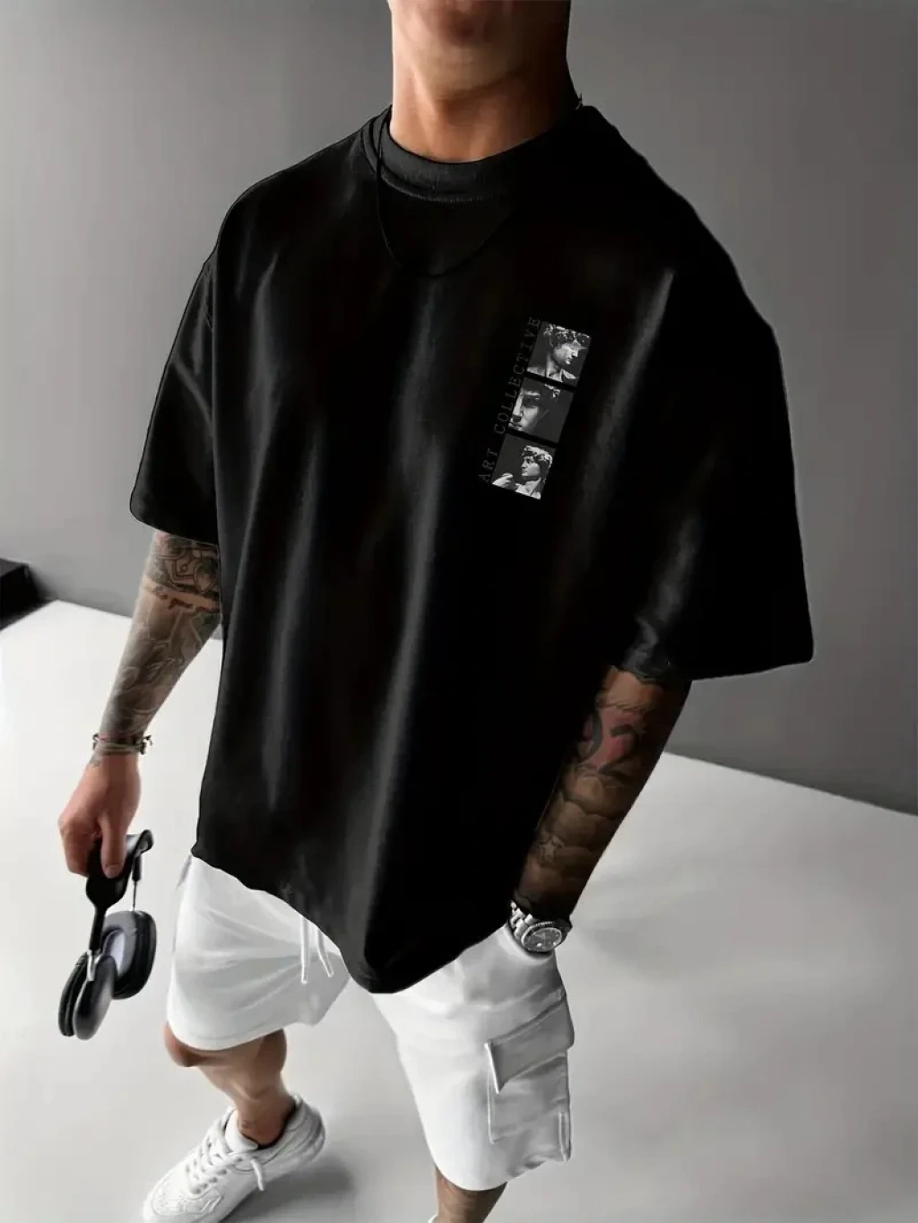 Benzersiz Sırt Baskılı Erkek Sokak Stili Bol Tişört - Nefes Alabilir Polyester, Makinede Yıkanabilir - Siyah