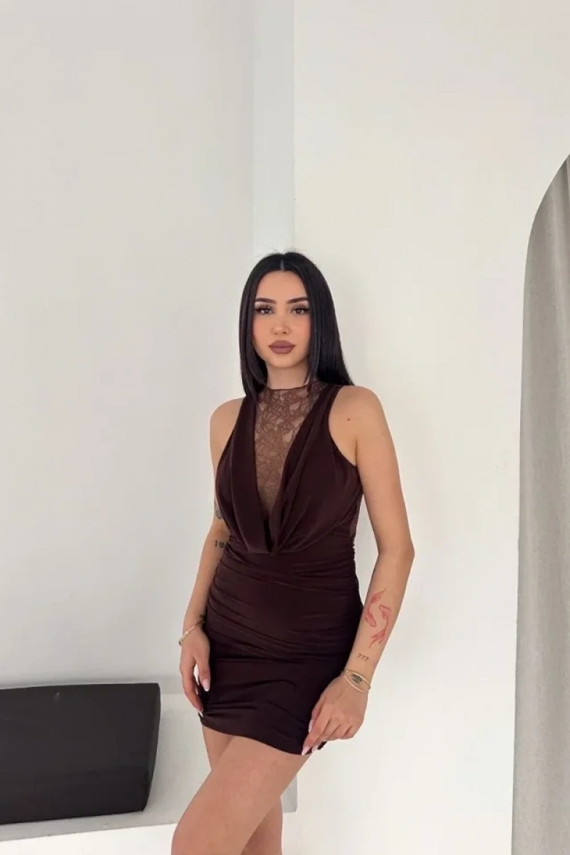 Dantel Detaylı Derin Dekolte Drapeli Mini Elbise Şık Kolsuz - Kahvrenegi