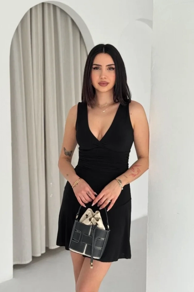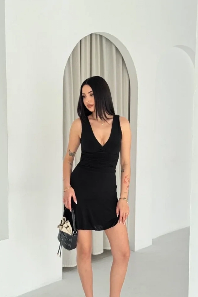 Derin V Yaka Sırt Dekolteli Mini Elbise Drapeli Şık Kolsuz - Siyah