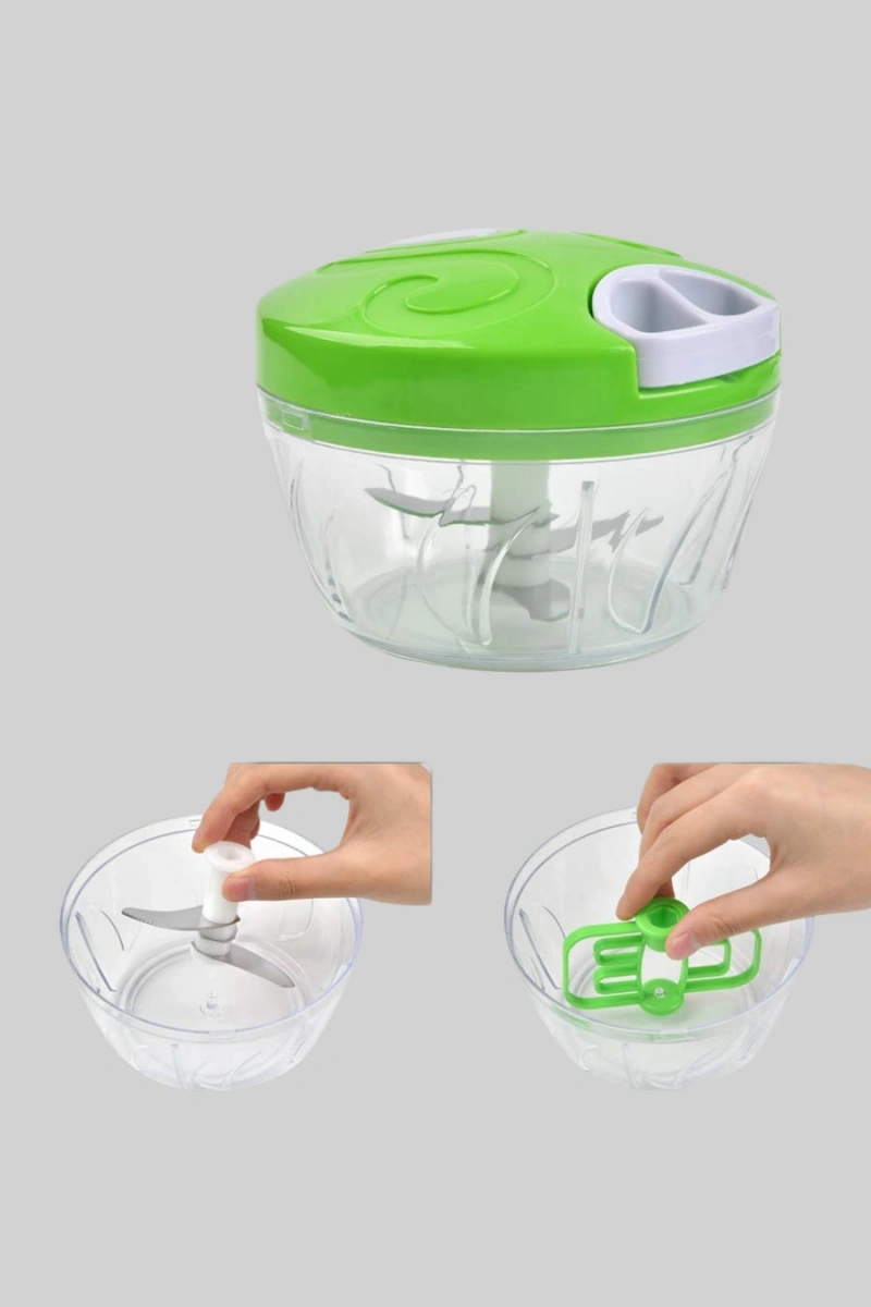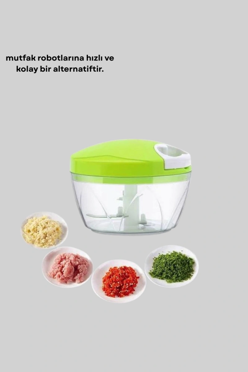 Manuel yiyecek doğrayıcı, mutfakta hız ve pratiklik arayanlar için tasarlanmış kullanışlı bir yardımcıdır. Elektrik gerektirmeyen ipli mekanizması sayesinde her ortamda rahatlıkla kullanılabilir. Üç adet paslanmaz çelik bıçağı, yiyecekleri kısa sürede eşit parçalara ayırarak yemek hazırlık süresini kısaltır. Küçük porsiyonlar için idealdir ve mutfak robotlarına kıyasla çok daha az yer kaplar. Kolay temizlenebilir yapısı, hijyenik ve güvenli kullanım sunar. Günlük yemek hazırlıklarında zaman kazandıran, pratik ve dayanıklı bir mutfak ürünüdür.