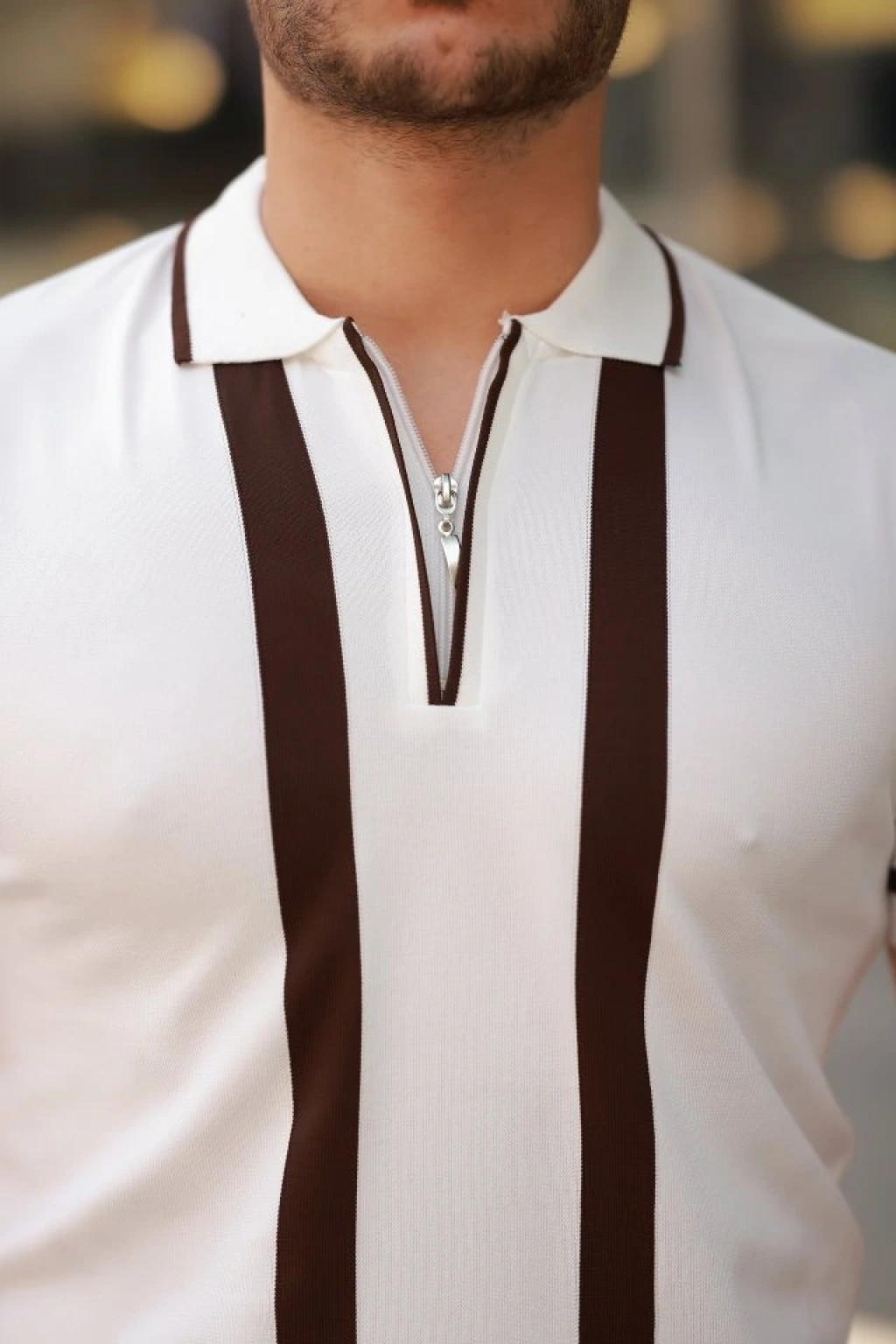 Erkek Fermuar Yakalı şerit Detaylı Kısa Kollu Tişört
