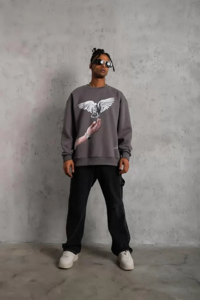 Erkek Güvercin Baskılı Sweatshirt - Gri