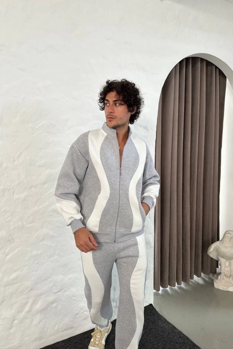 Erkek Çift Şeritli Eşofman Takım Dik Yaka Fermuarlı Sweatshirt Boru Paça Alt, Oversize 3 Iplik Pamuklu - Gri