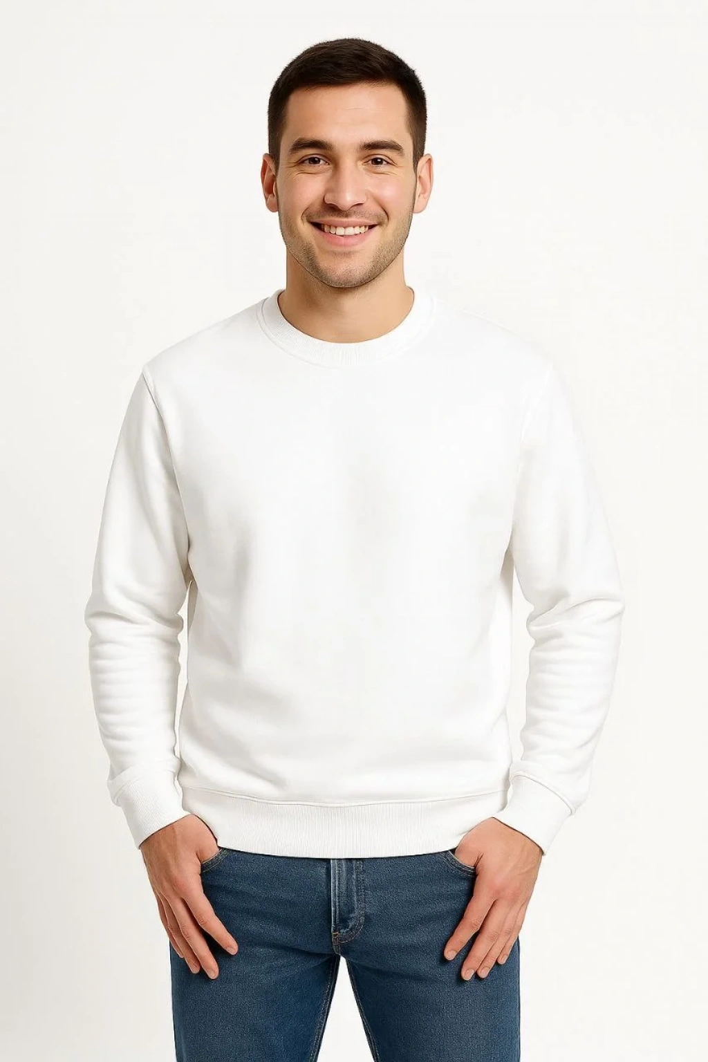 Erkek Üç İplik Düz Bisiklet Yaka SweatShirt - Beyaz
