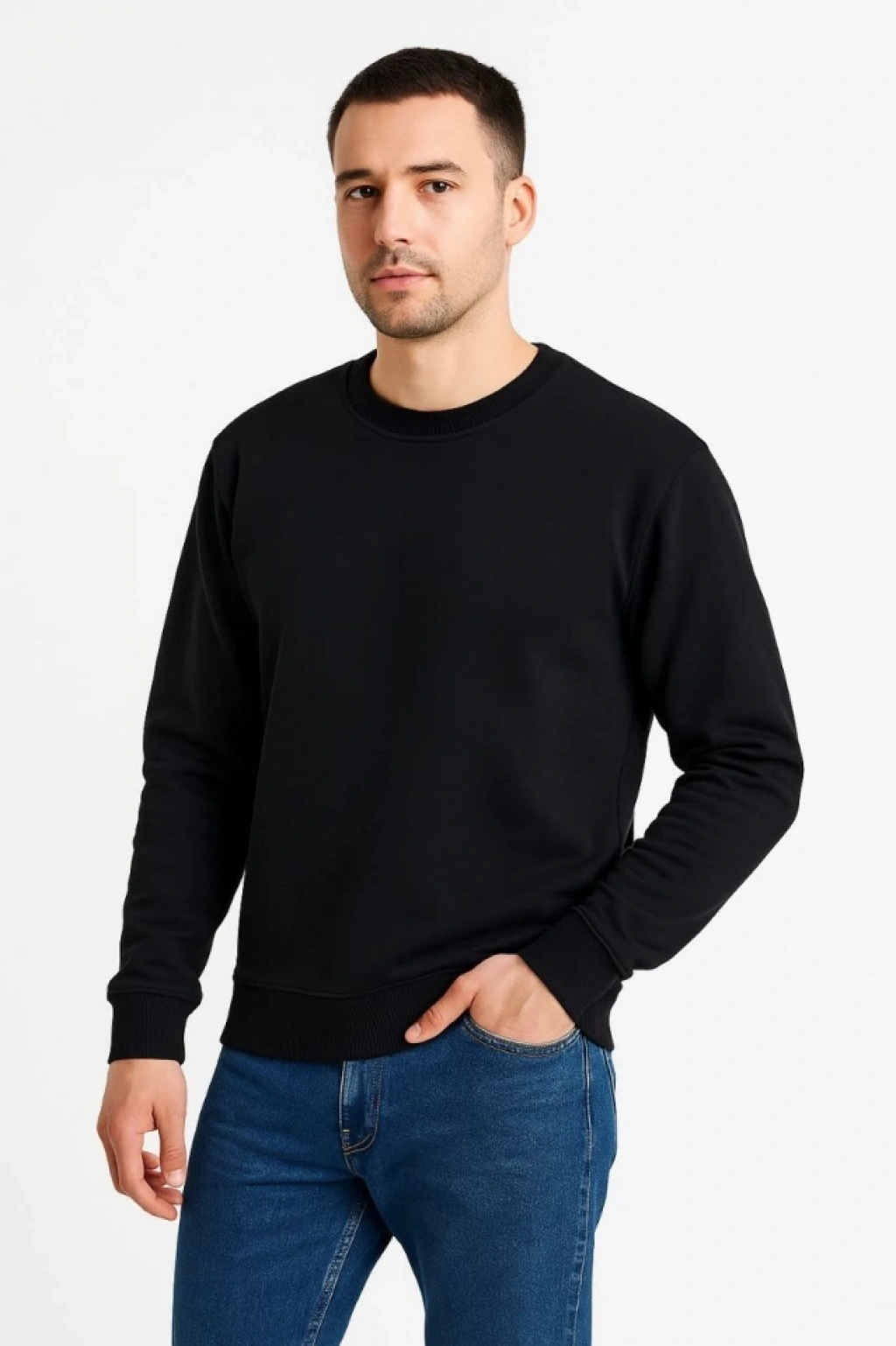 Erkek Üç İplik Düz Bisiklet Yaka SweatShirt - Siyah