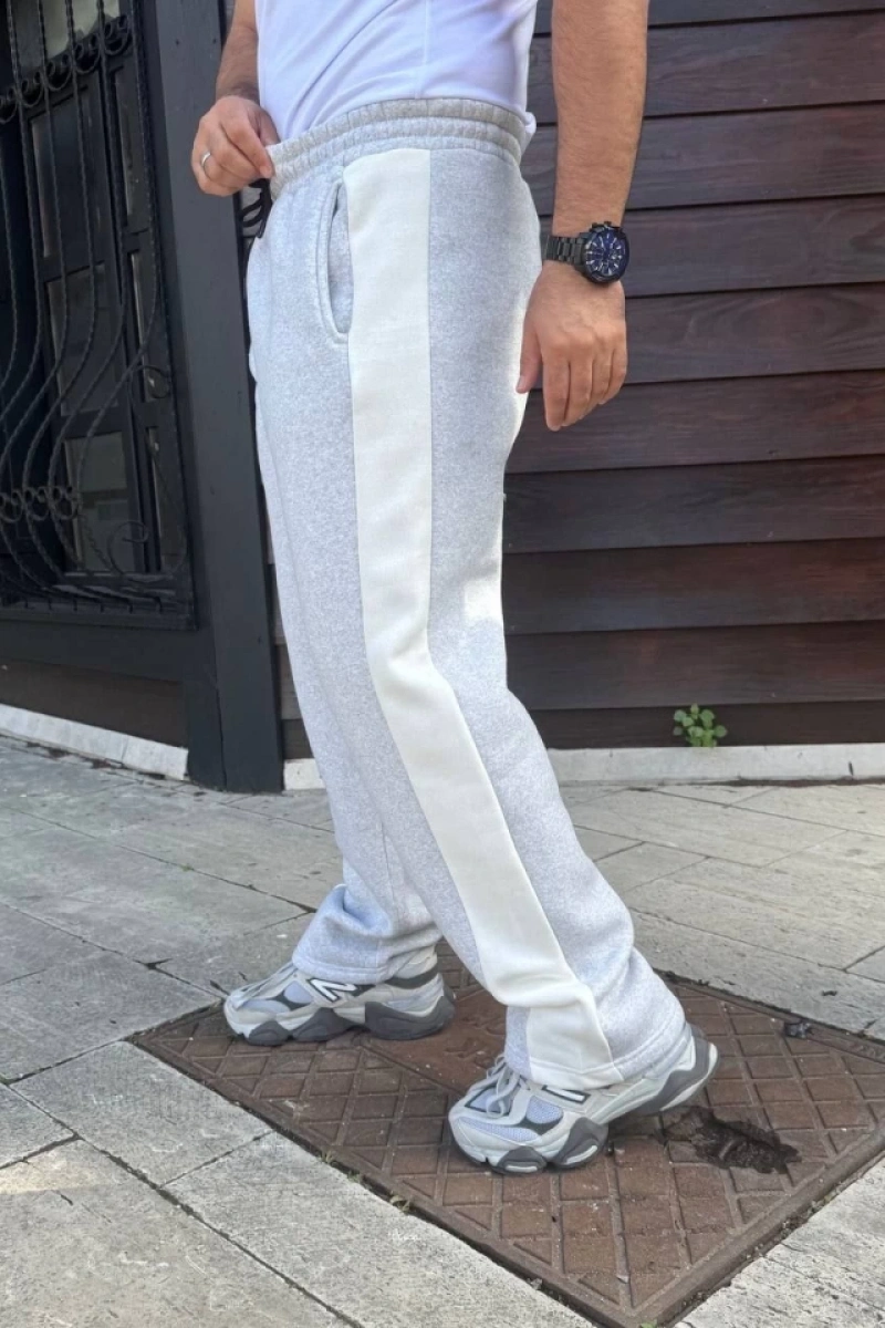 Erkek Üç İplik Kışlık Pamuklu Yandan Garneli Kalın Bej Şeritli Cepli Eşofman Altı - Gri