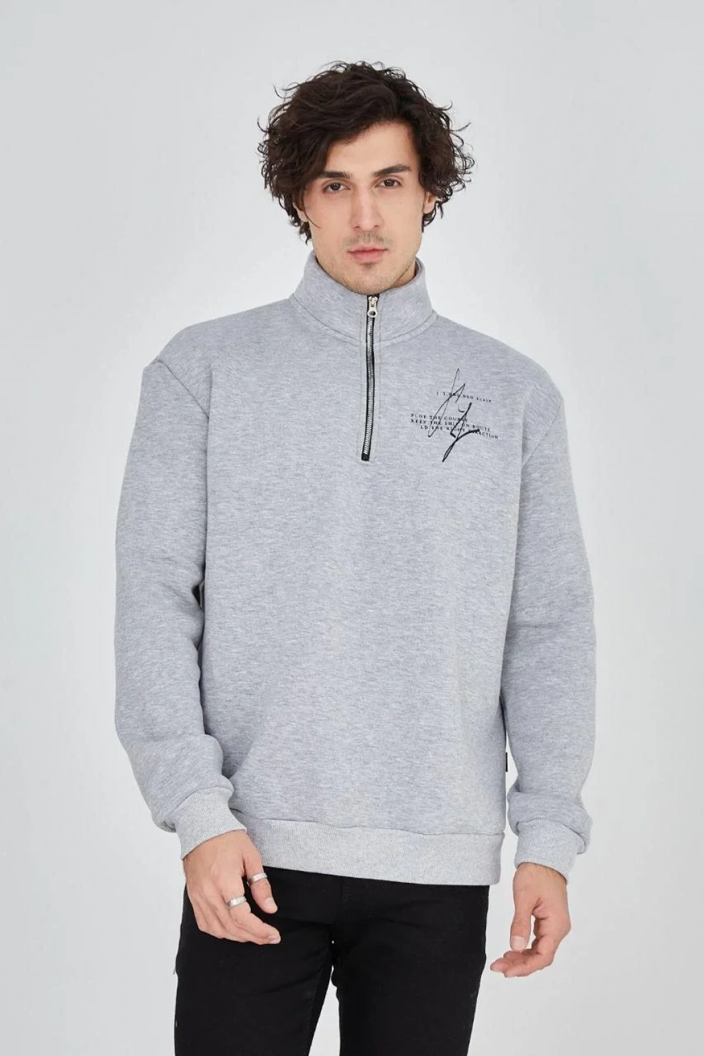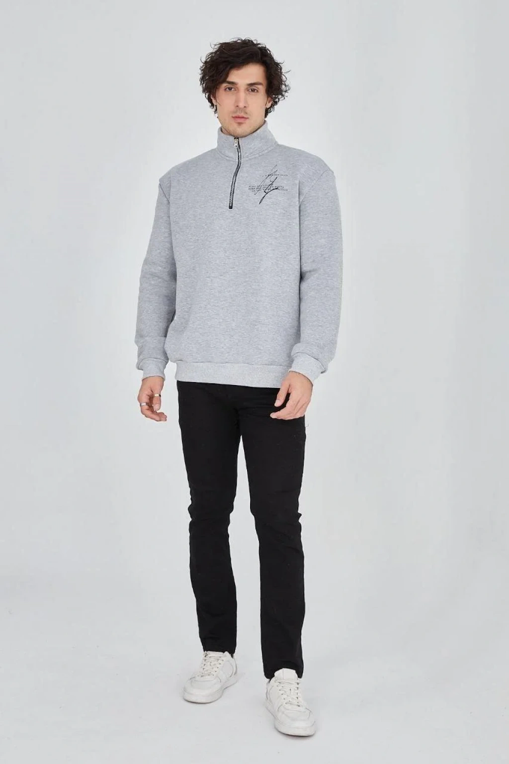 Erkek Yarım Fermuarlı Baskılı Sweat - Gri