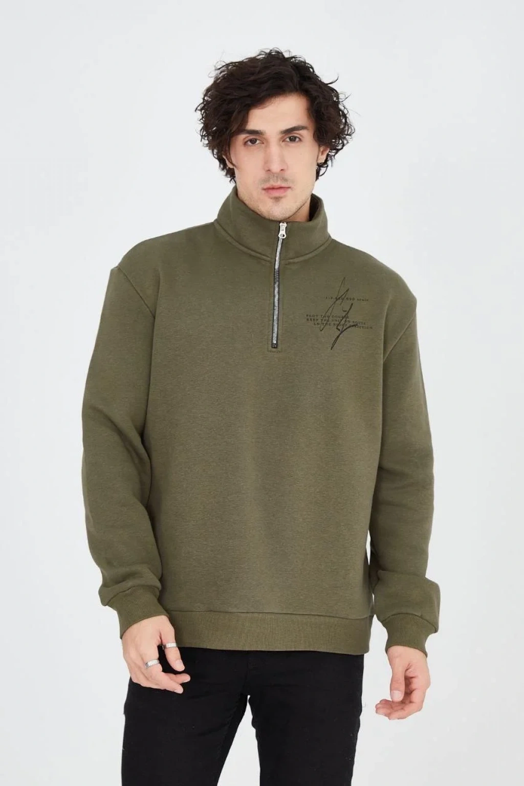Erkek Yarım Fermuarlı Baskılı Sweat - Yeşil