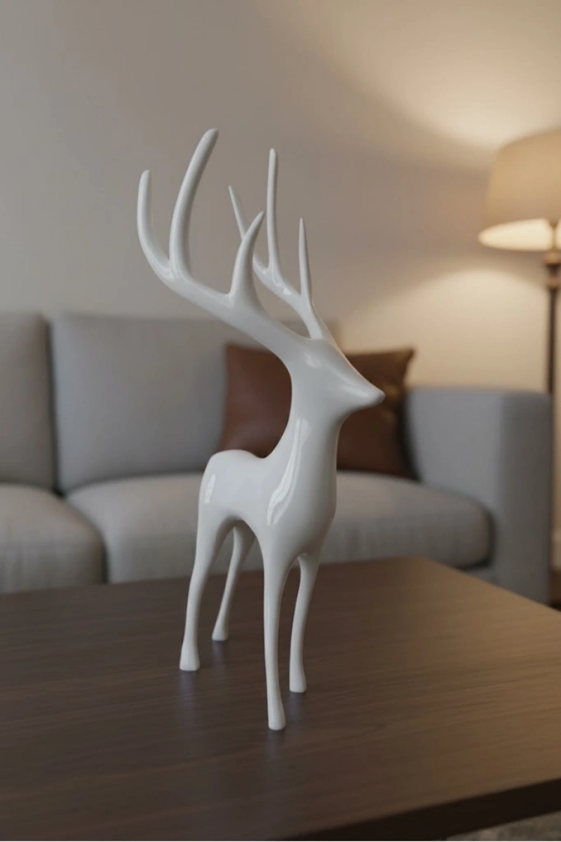 Geyik figürü, beyaz rengi ve modern tasarımıyla dekorasyona zarif bir karakter kazandırır. 12×24 cm ölçüsü, ürünü hem masa üstü hem de raf dekoru için kullanışlı hale getirir. Salon, ofis veya giriş alanlarında şık bir detay olarak öne çıkar. Minimal çizgileri sayesinde bulunduğu ortamda göz yormadan dekorasyonu tamamlar ve ferah bir atmosfer oluşturur.
