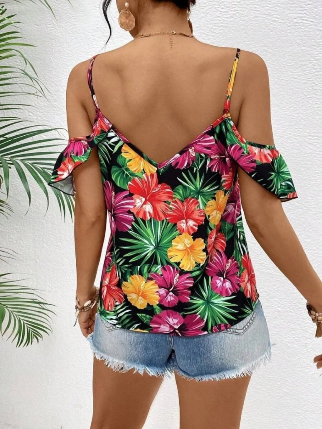 Kadın Askılı Omuzlardan Açık çiçek Baskılı Bluz