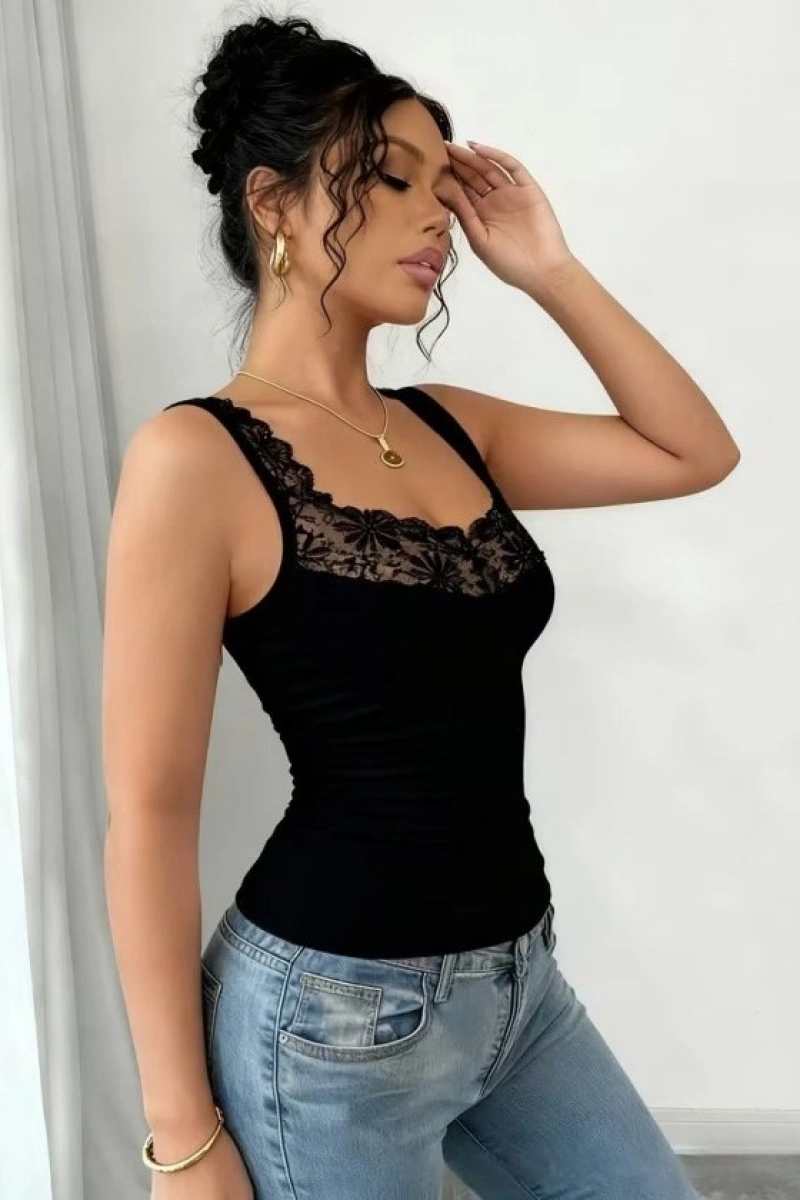 Kadın Askılı V Dantel Yakalı Viskon Bluz