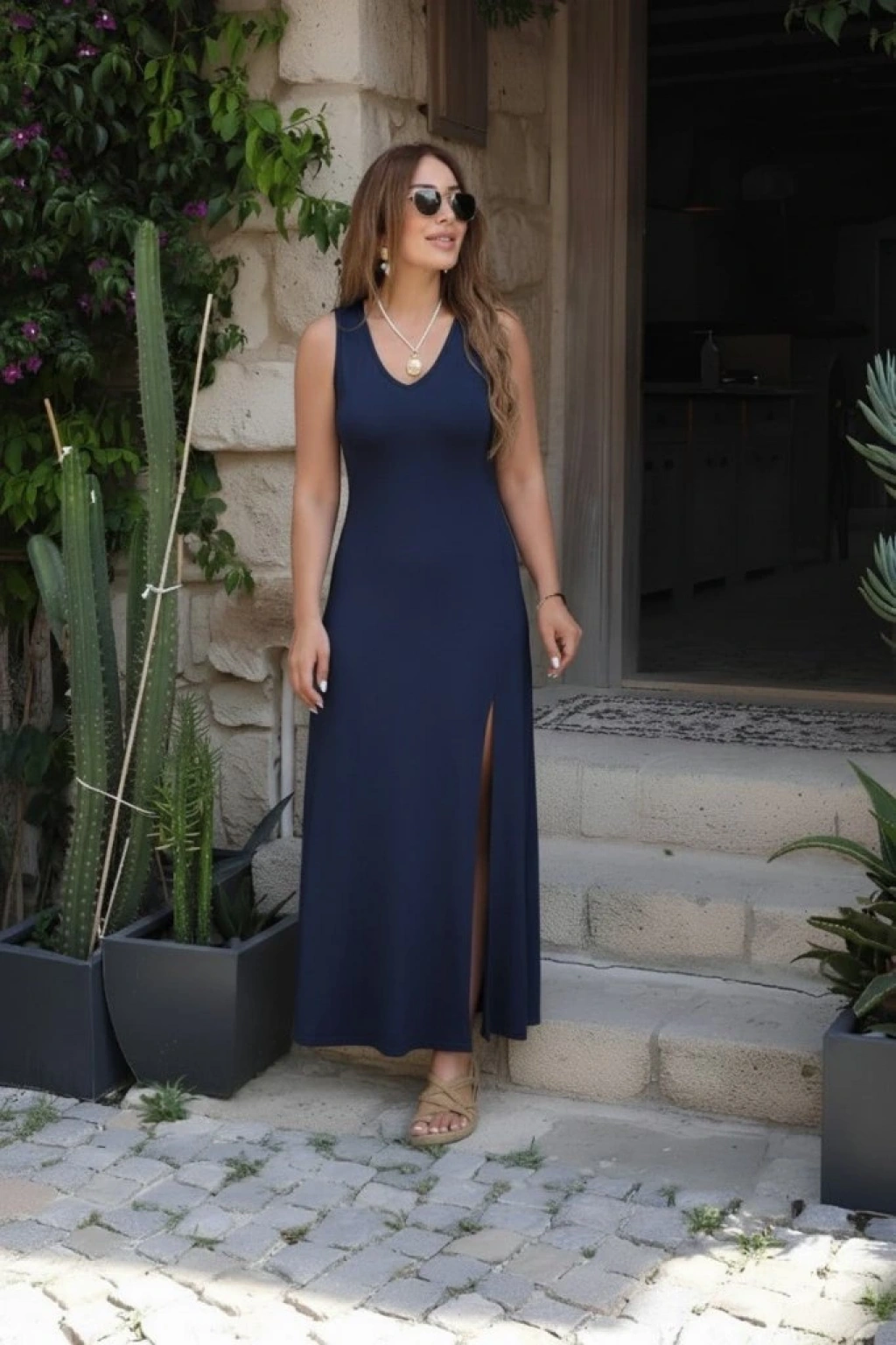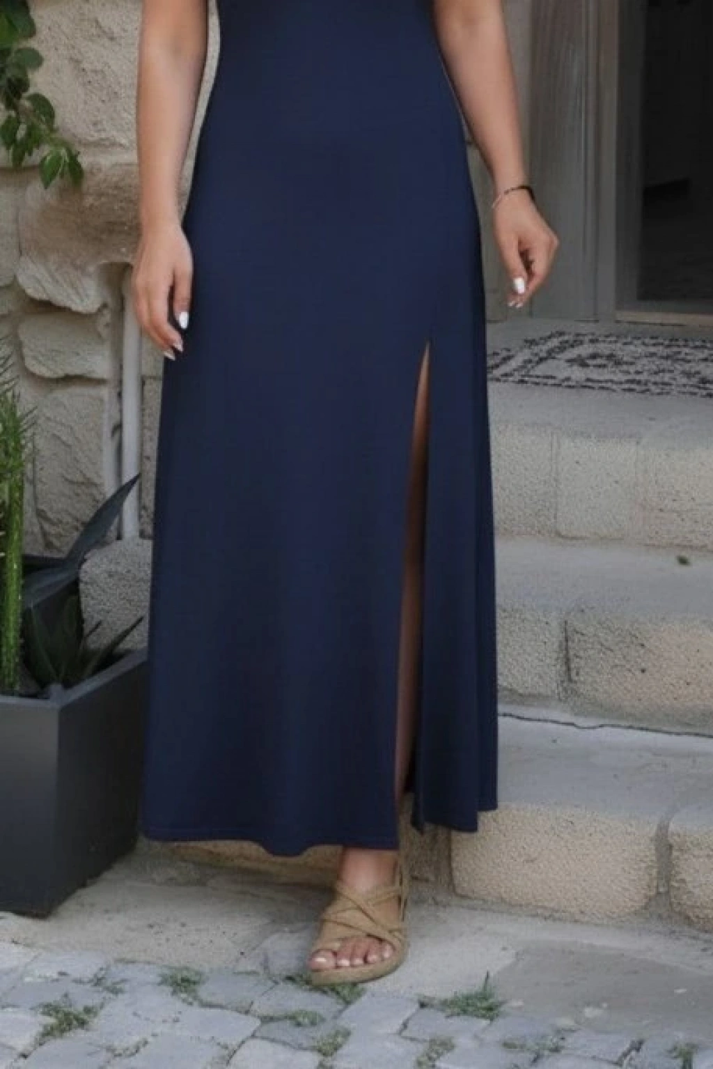 Kadın Askılı V Yakalı Yırtmaçlı Uzun Viskon Elbise