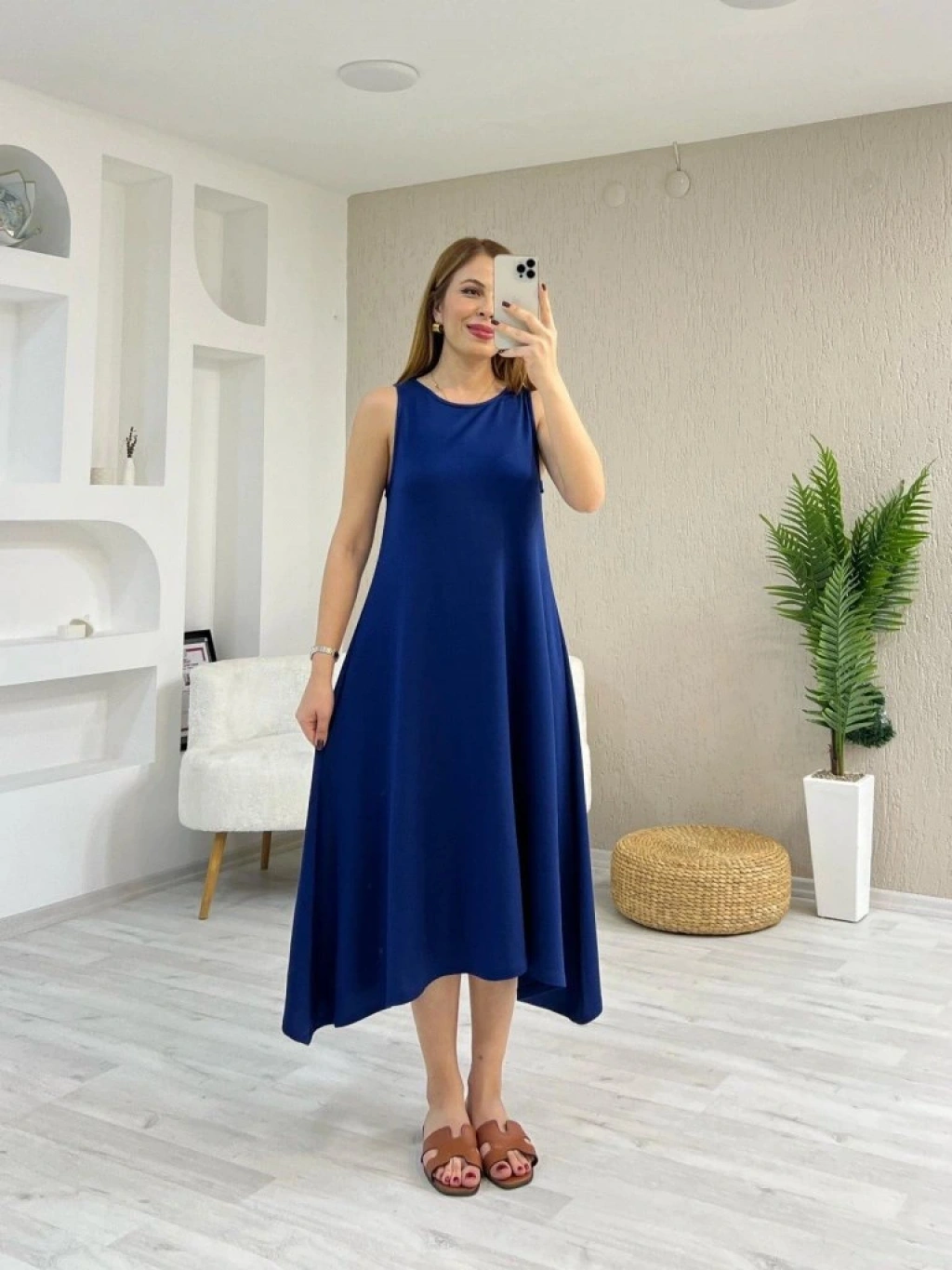 Kadın Askılı Yuvarlak Yakalı Asimetrik Kesim Detaylı Viskon Elbise