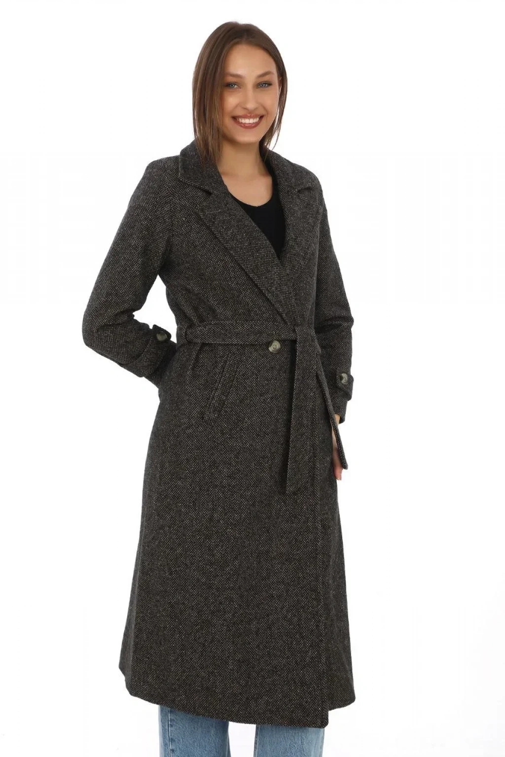 Kadın Astarlı Balık Sırtı Kaşmir Kaşe Kaban - Kahverengi