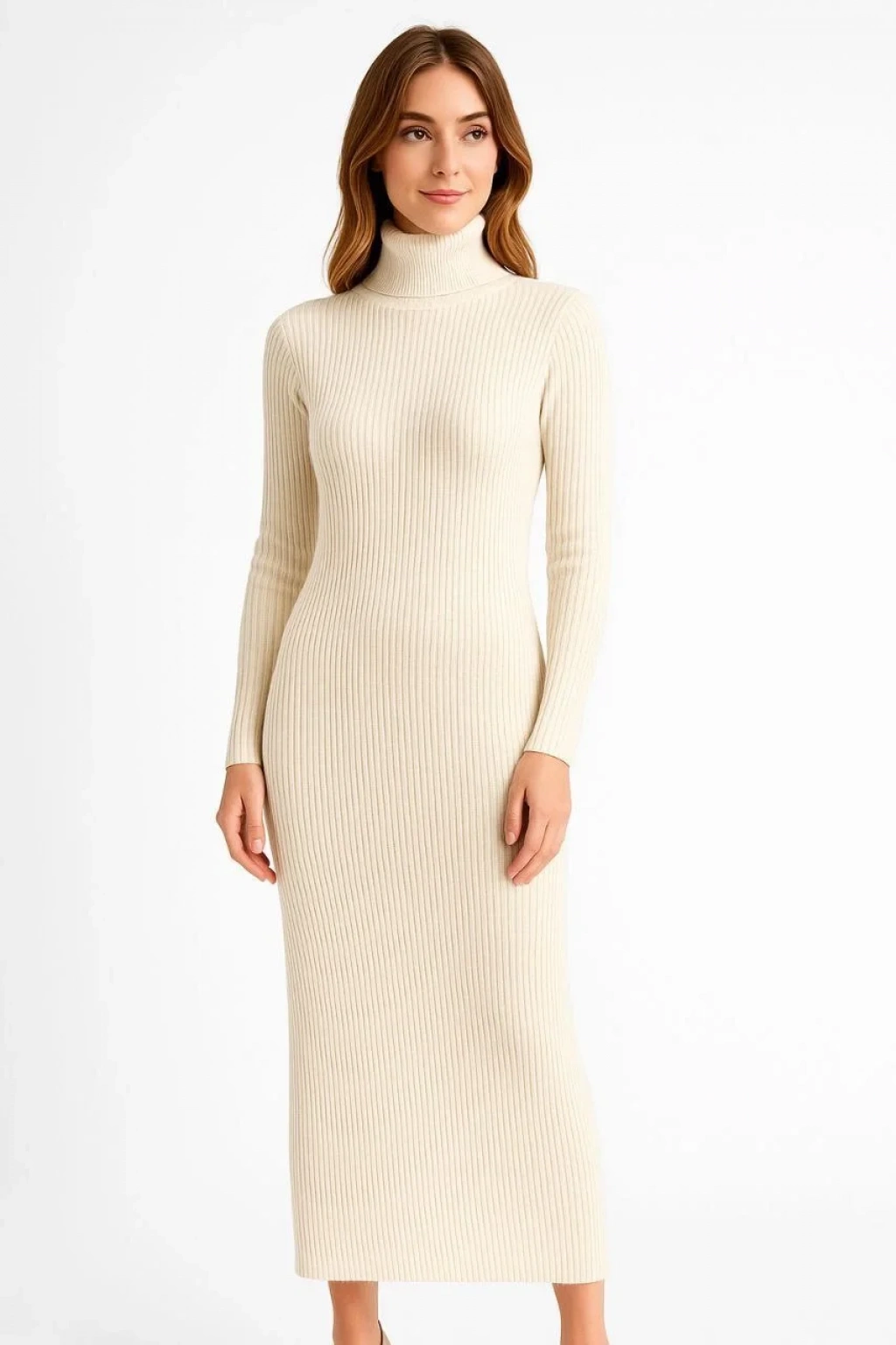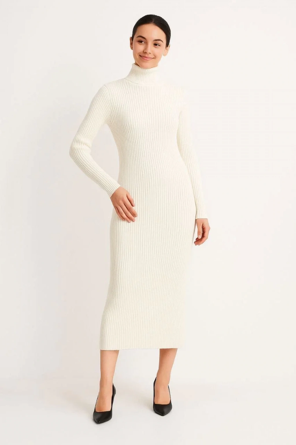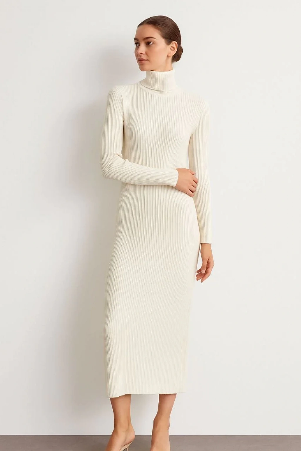Kadın Boğazlı Uzun Fitilli Triko Dokuma Elbise - Beyaz