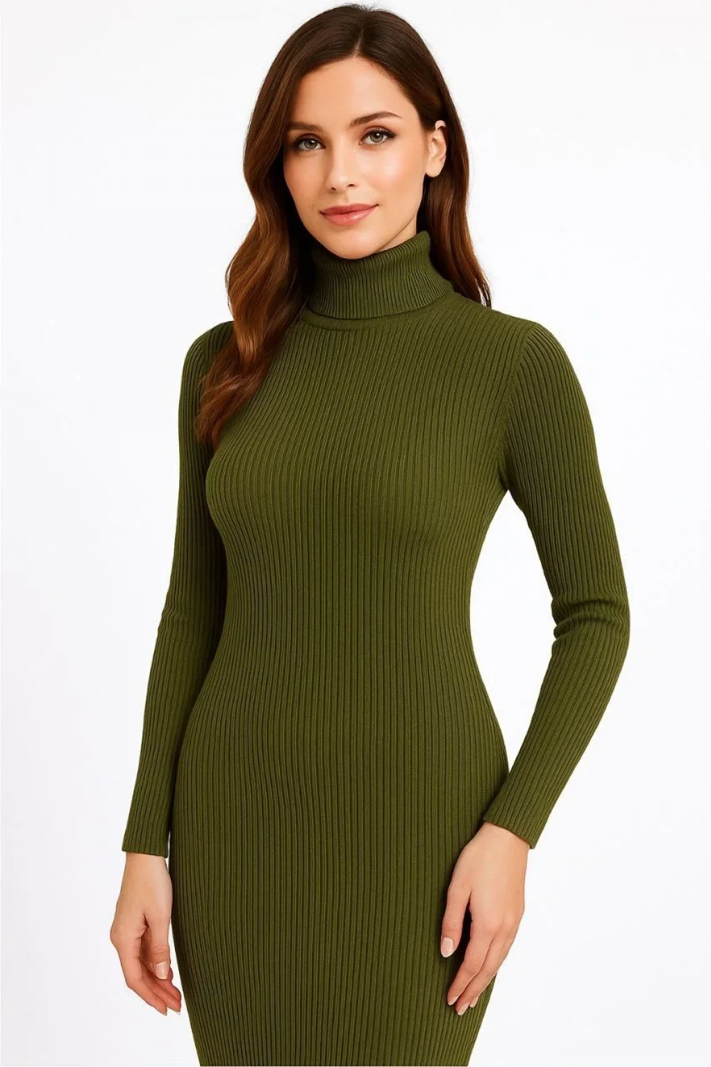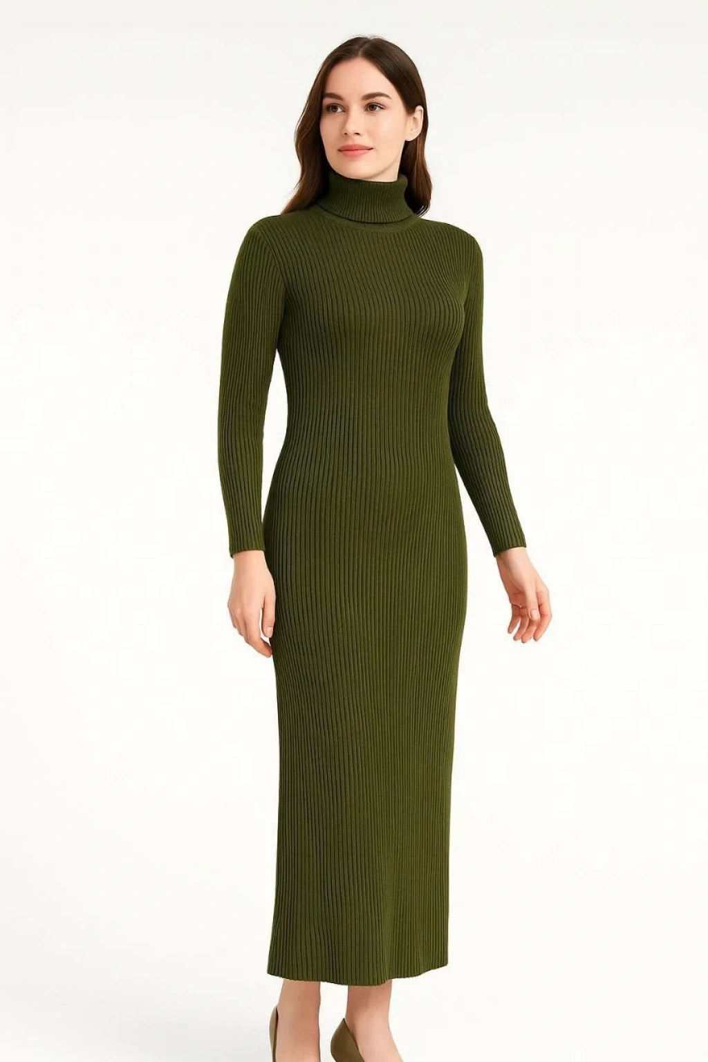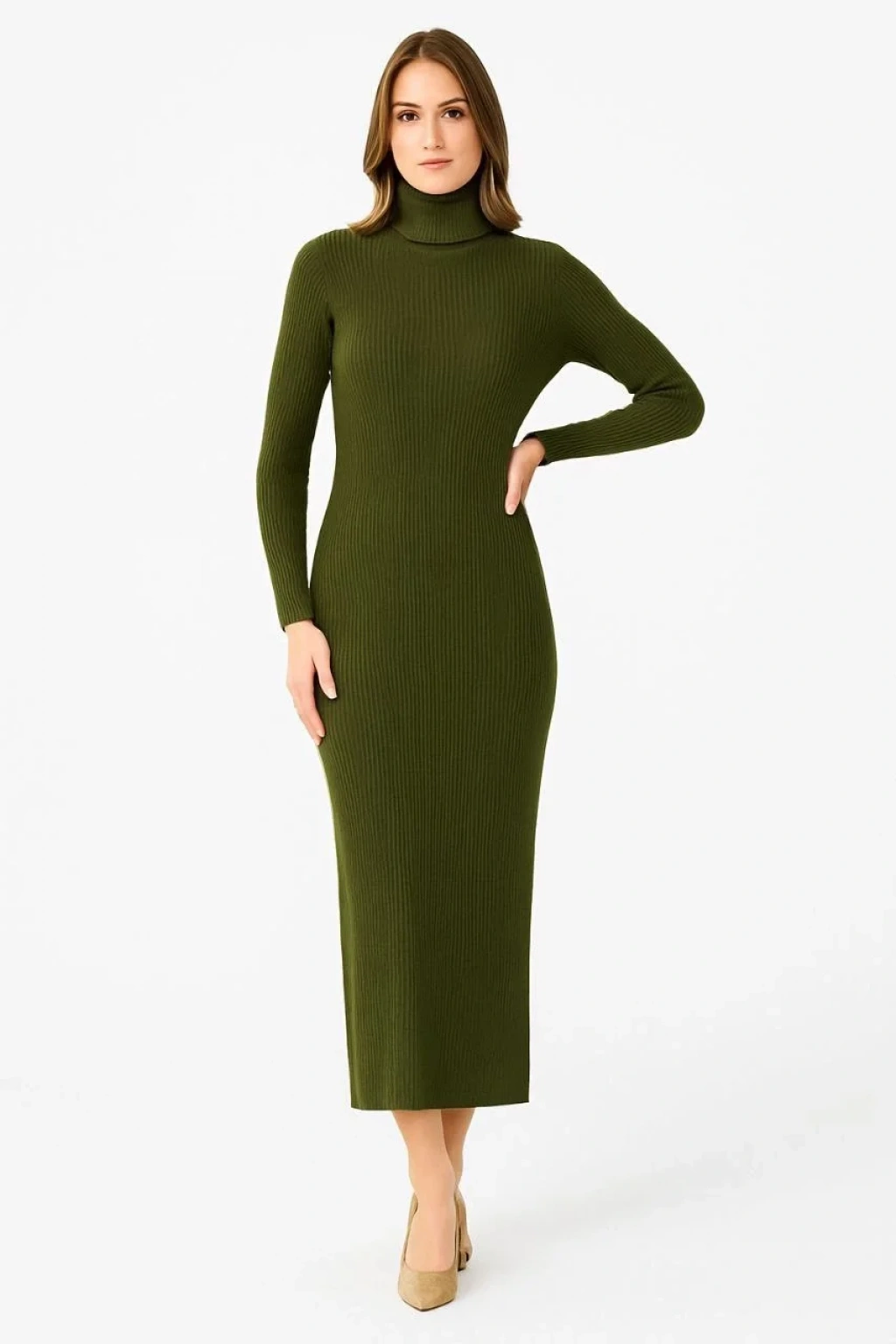 Kadın Boğazlı Uzun Fitilli Triko Dokuma Elbise - Haki
