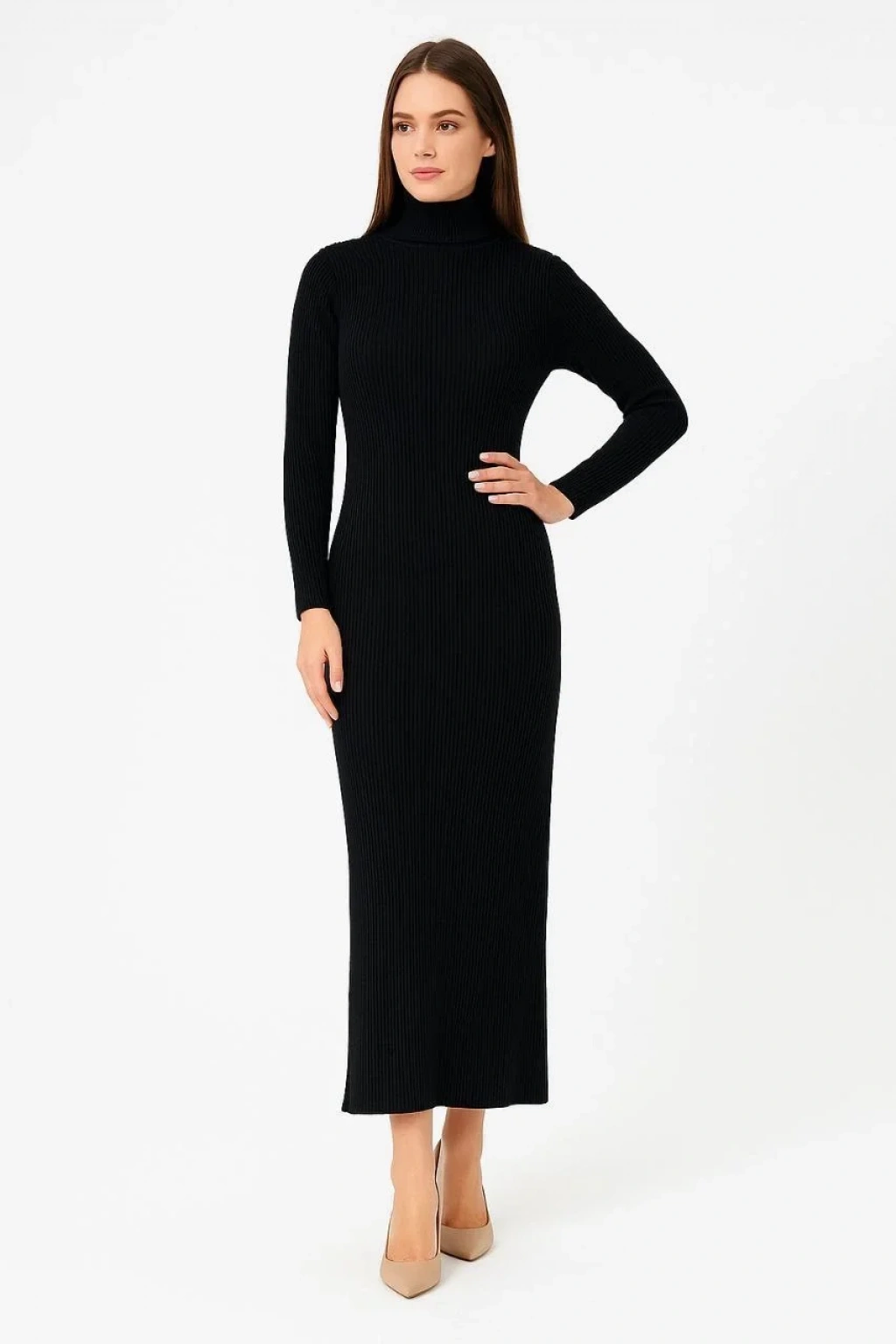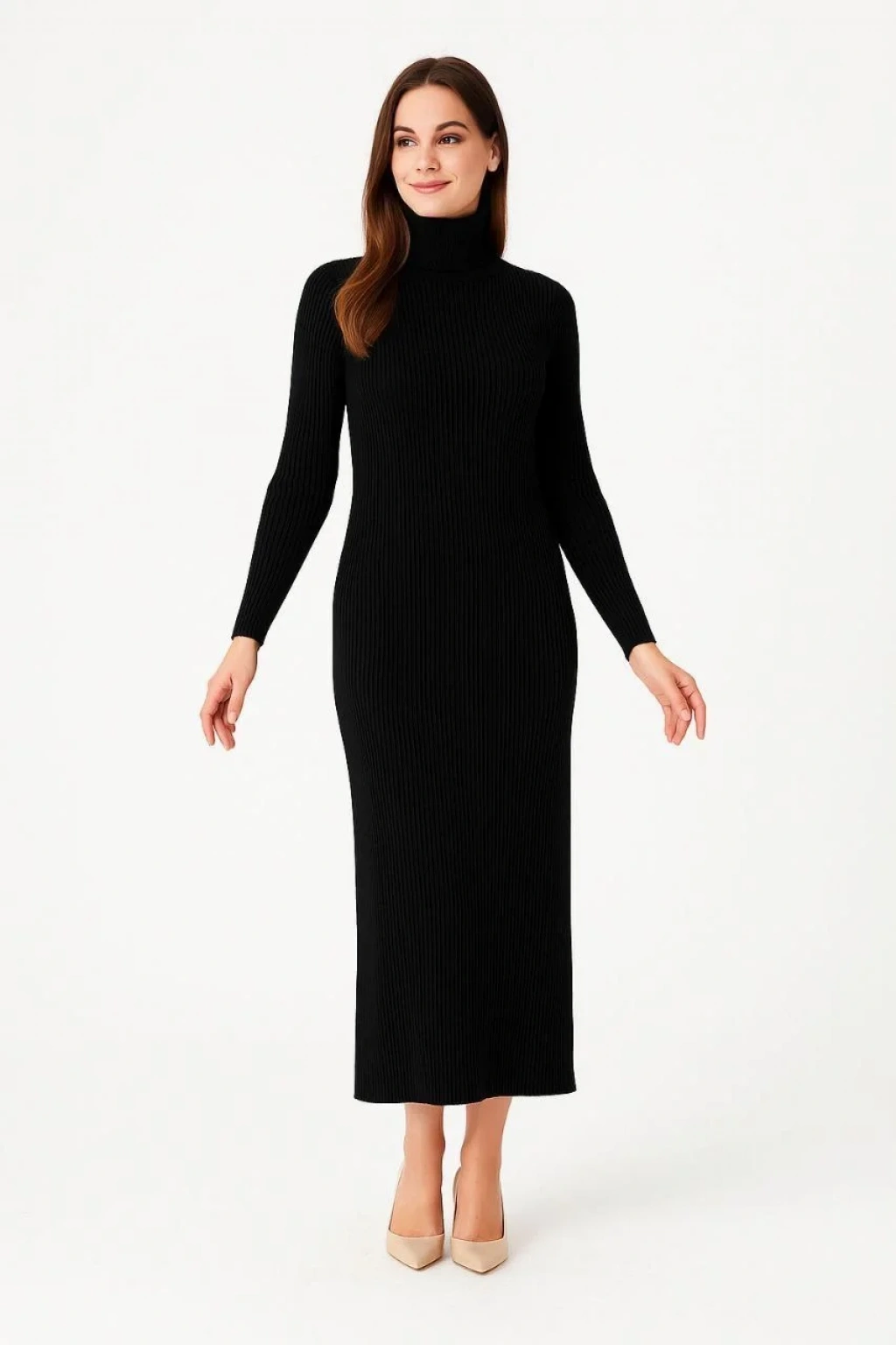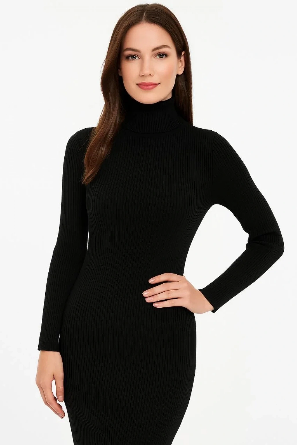 Kadın Boğazlı Uzun Fitilli Triko Dokuma Elbise - Siyah