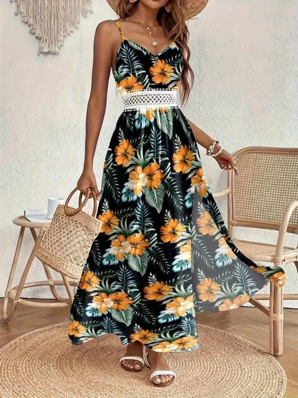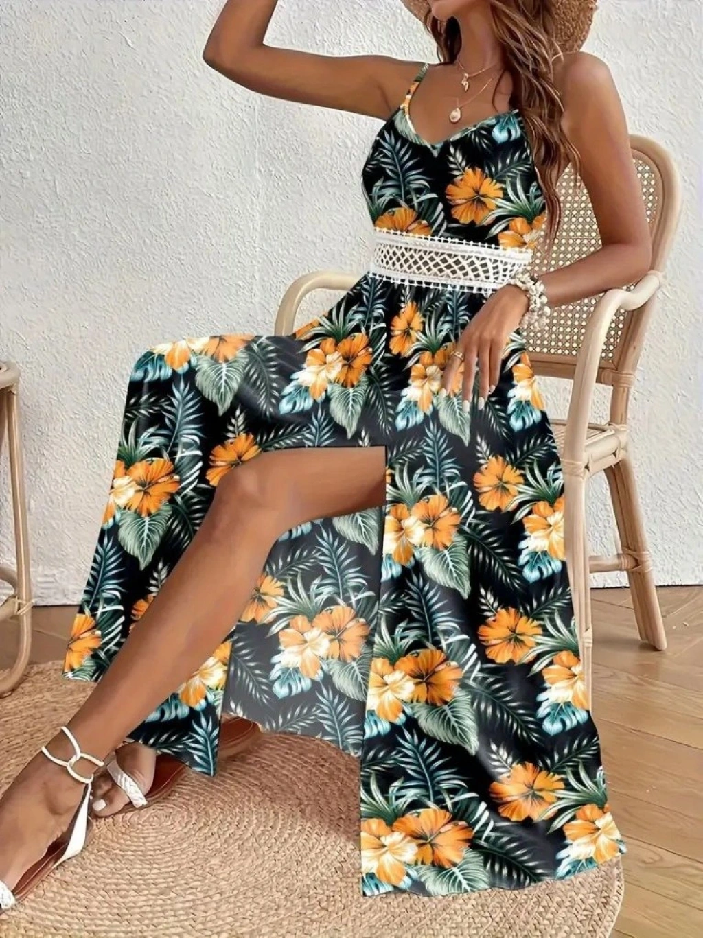 Kadın Ip Askılı V Yakalı Bel Güpür çiçek Desenli Yandan Yırtmaçlı Maksi Süprem Elbise