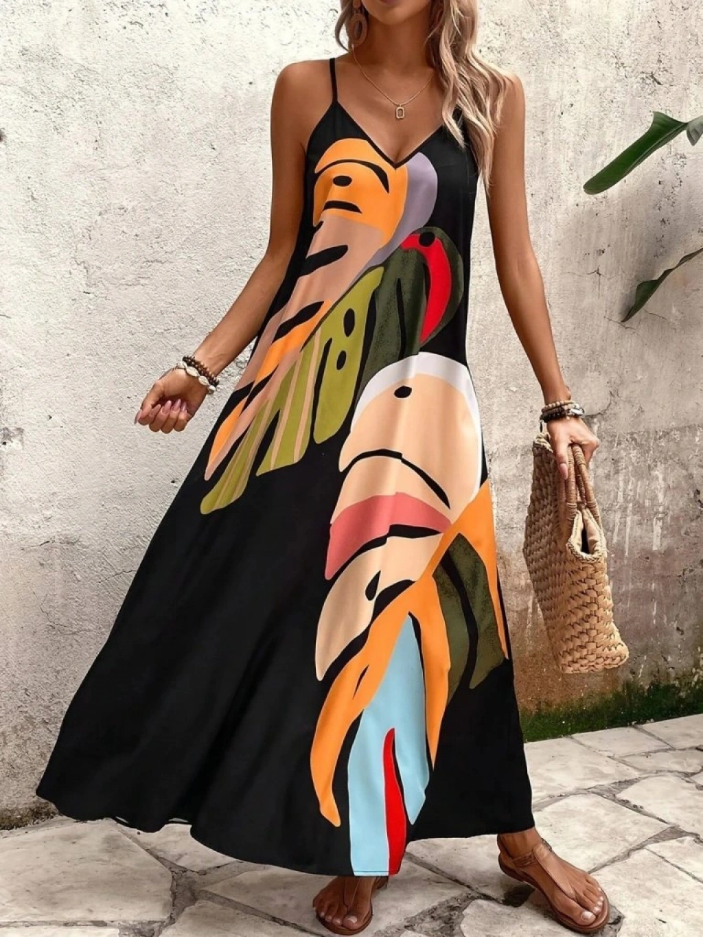 Kadın Ip Askılı V Yakalı Desenli Süprem Maxi Elbise