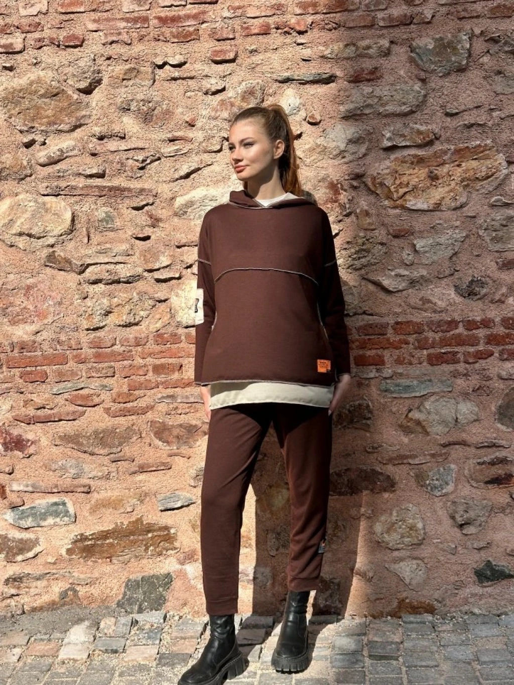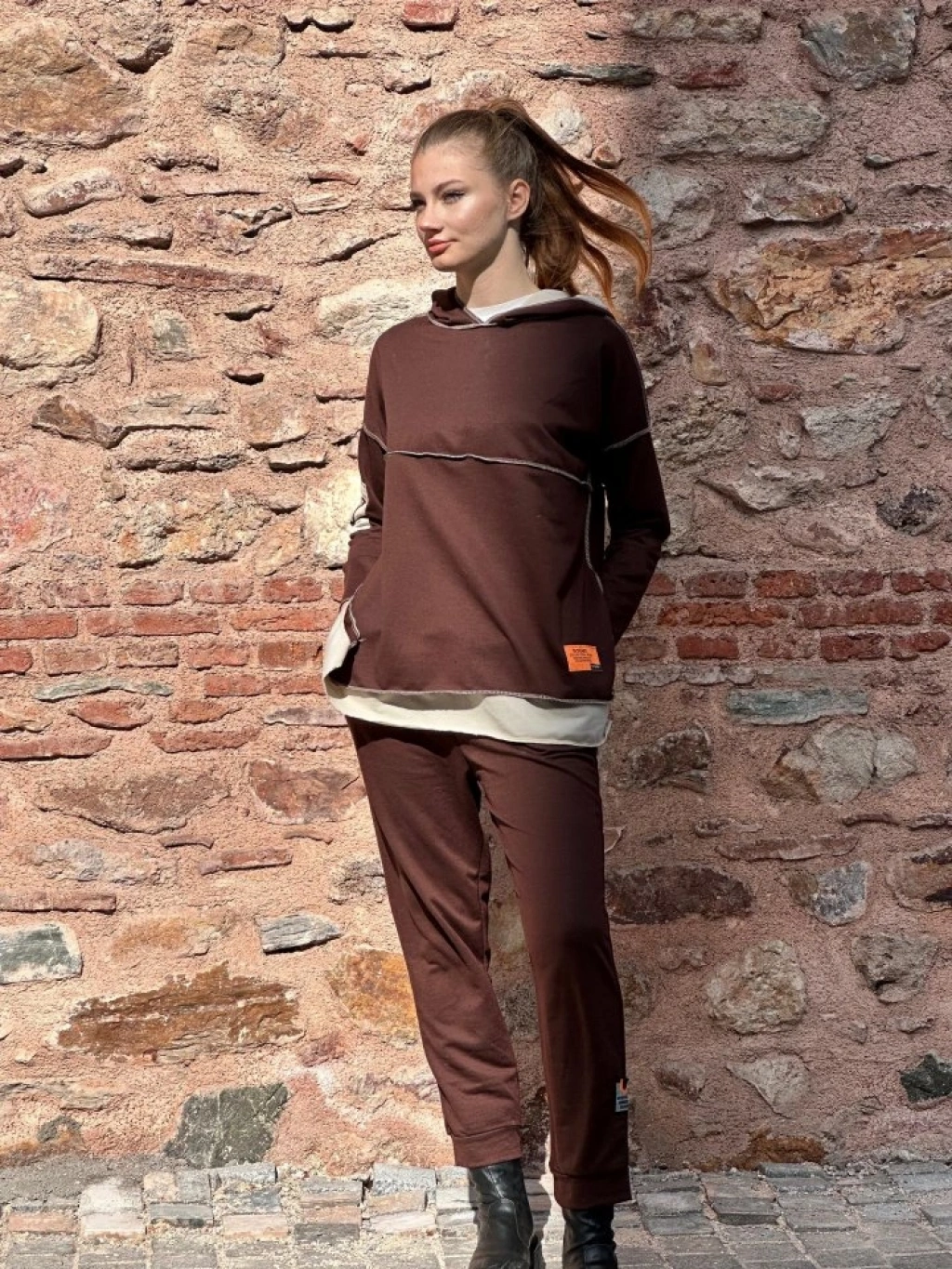 Kadın Kahve Kapşonlu Etek Ucu Detay Arma Ters Dikiş Gorunumlu Ikili Takım