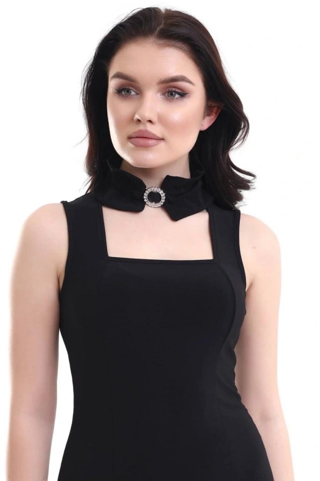 Kadın Kare Yaka Taş Detaylı Yaka Aksesuarlı Sandy Kumaş Fırsat Ürün Diz Üstü Elbise