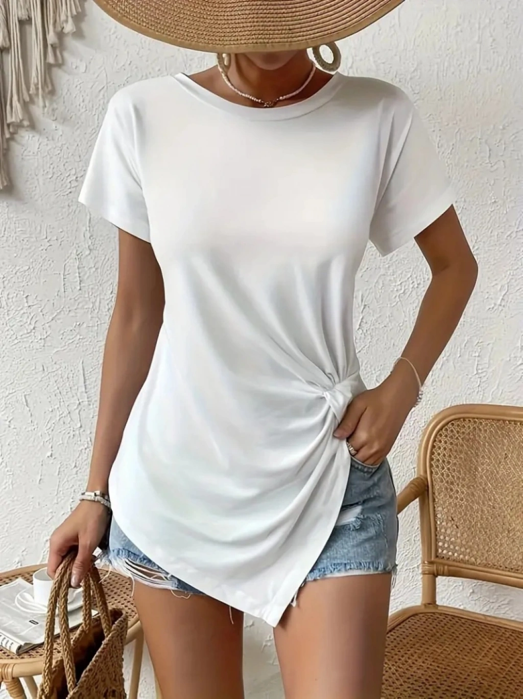 Kadın Kısa Kollu Asimetrik Kesim Bel Büzgü Düğüm Detay Viskon Bluz