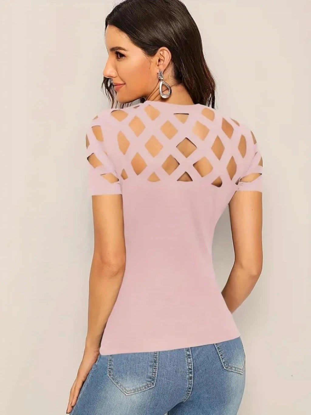 Kadın Kısa Kollu Baklava Desen Lazer Kesim Ithal Krep Bluz