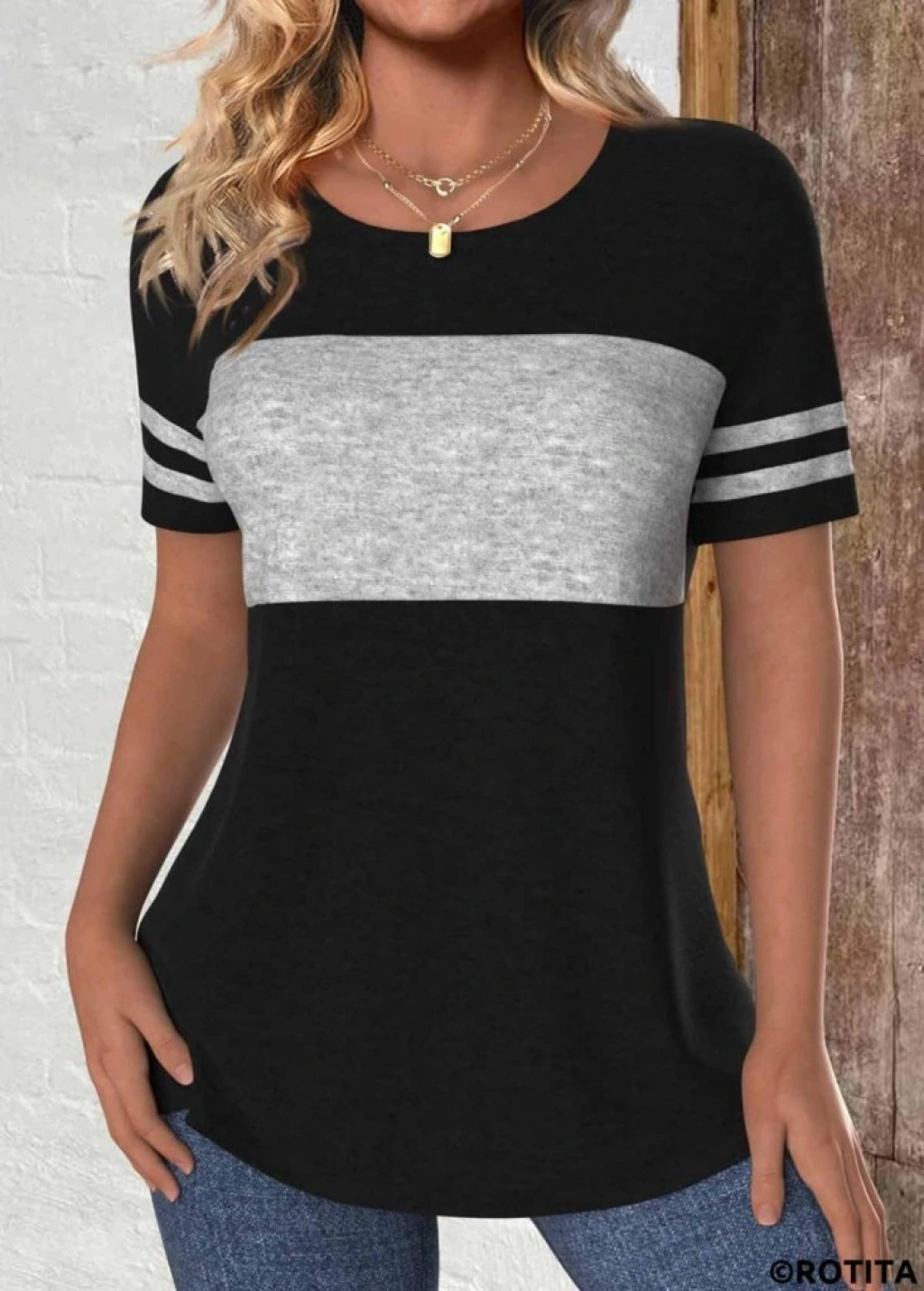 Kadın Kısa Kollu Bisiklet Yaka çift Renkli Viskon Bluz