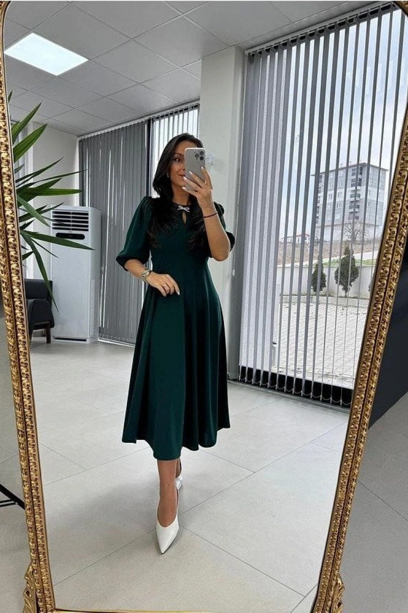Kadın Kısa Kollu Bisiklet Yaka Fiyonk Broşlu Midi Janjan Krep Elbise
