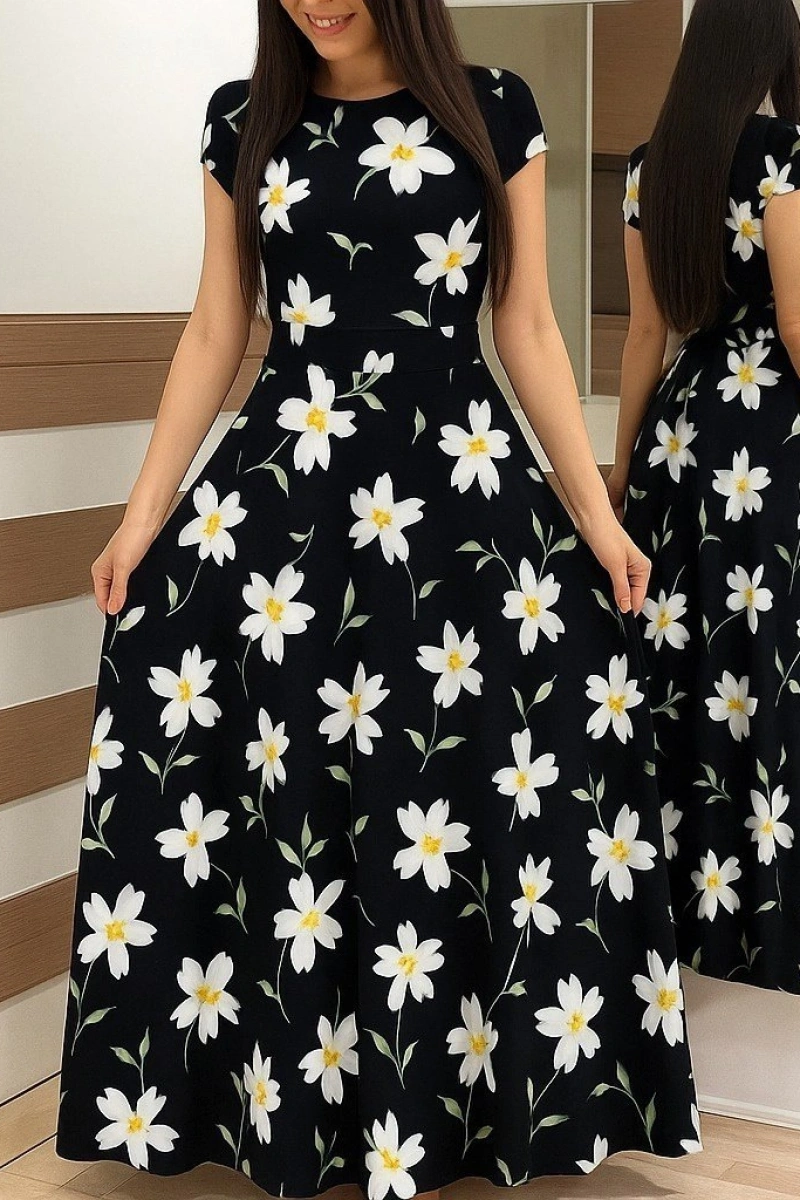 Kadın Kısa Kollu Bisiklet Yaka Puantiyeli Maksi örme Krep Elbise