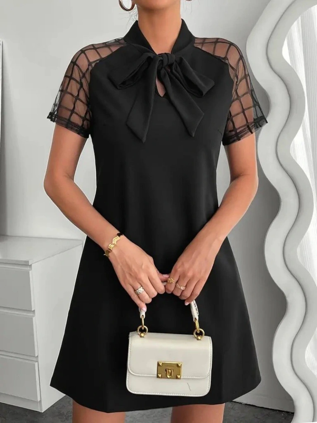 Kadın Kısa Kollu Boyundan Bağlamalı Omuzlarda Tül Detaylı Janjan Krep Elbise