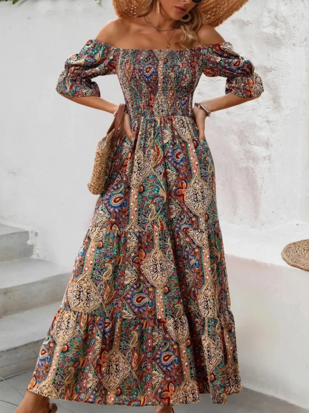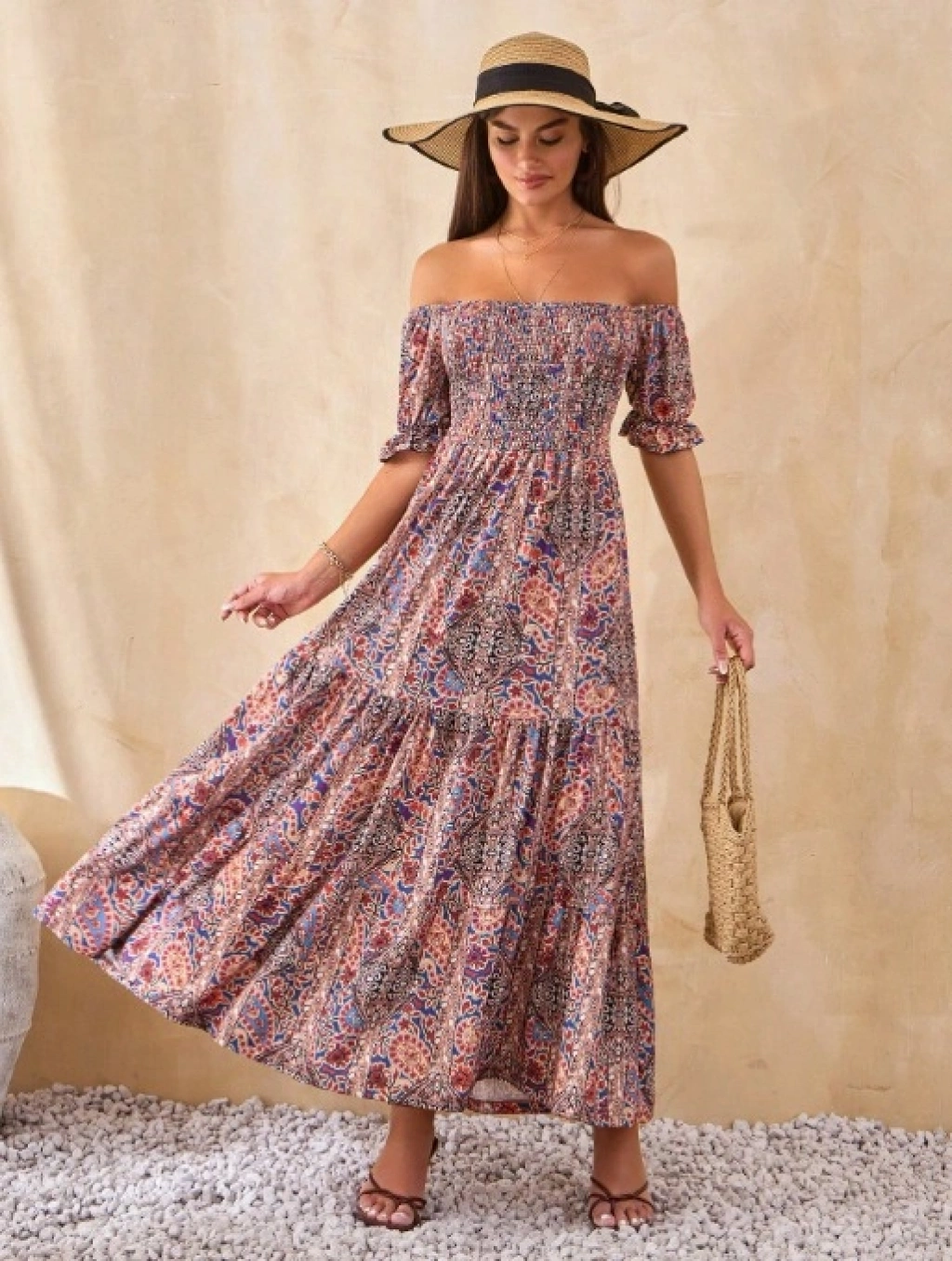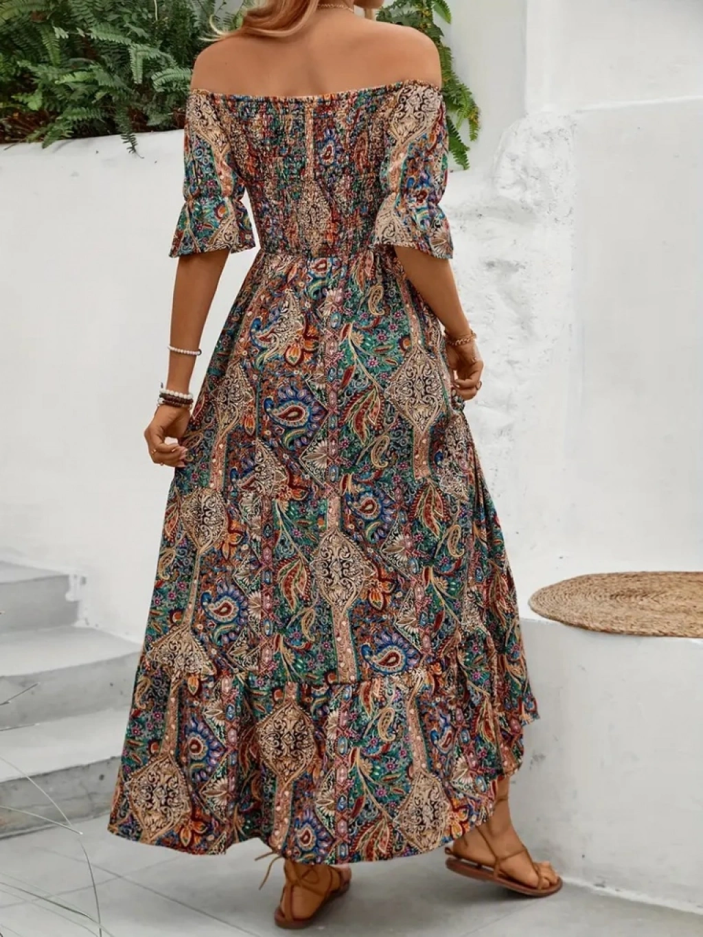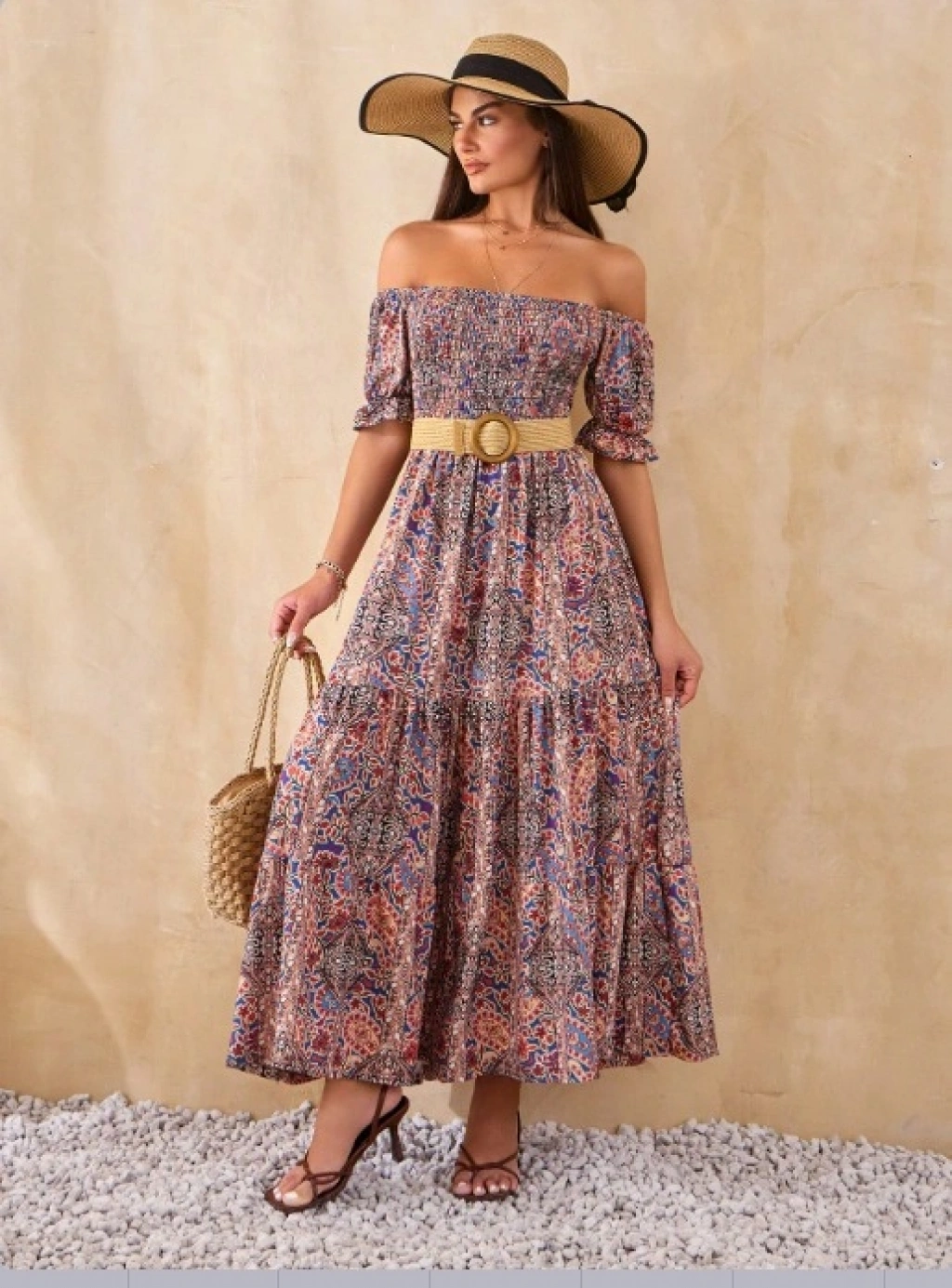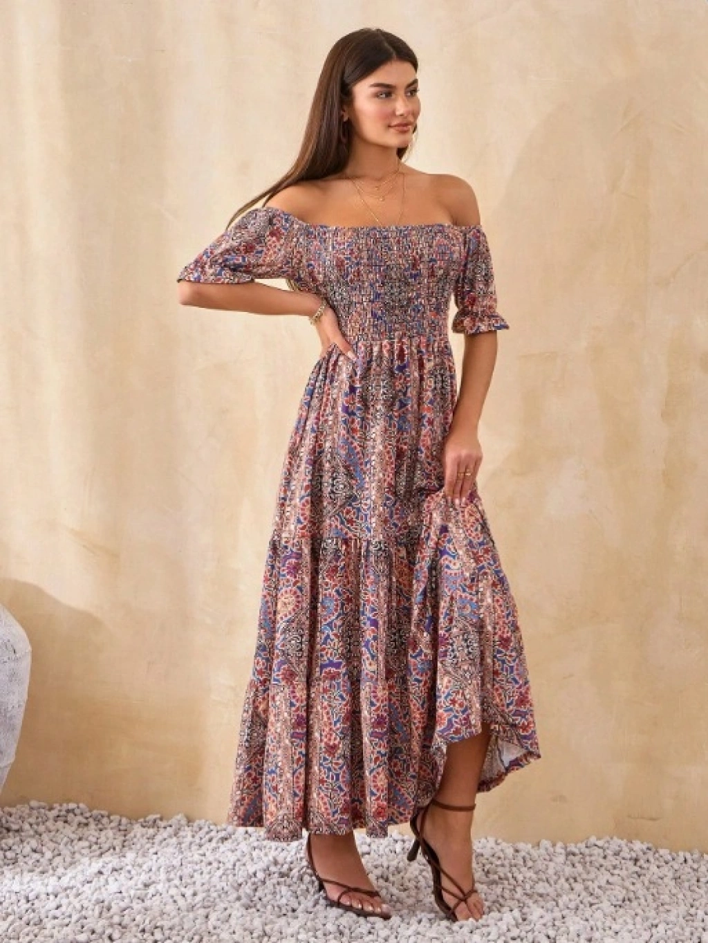 Kadın Kısa Kollu Düşük Omuzlu Beli Büzgülü Dijital Desenli Kesik Elyaf Süprem Uzun Elbise