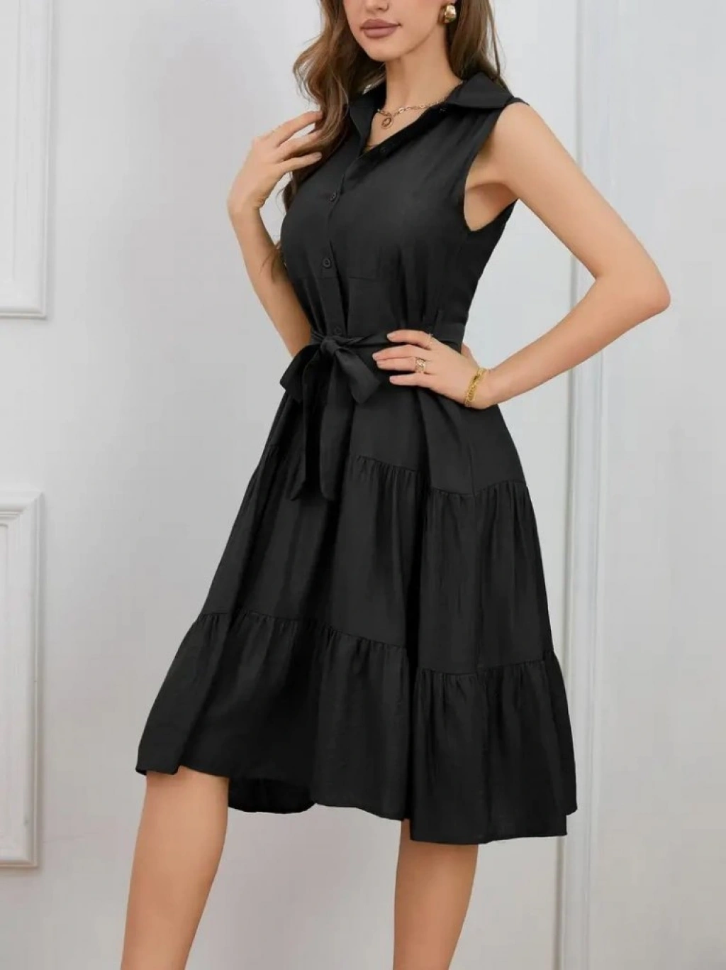Kadın Kısa Kollu Gömlek Yaka Düğmeli Beli Kuşaklı Katlı Dokuma Midi Elbise