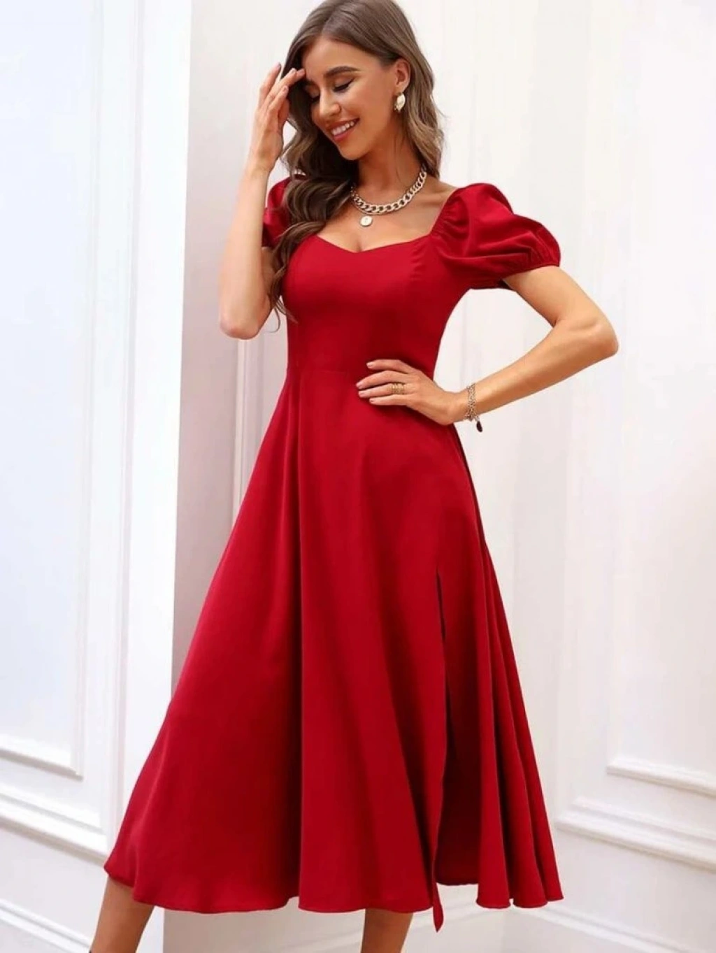 Kadın Kısa Kollu Kare Yakalı Yırtmaçlı Midi Janjan Krep Elbise
