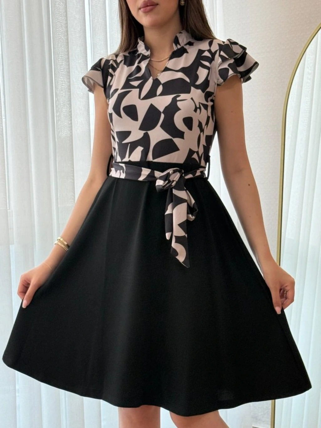 Kadın Kısa Kollu Kolu Fırfır Detay Mini Kuşaklı Kloş Krep Elbise
