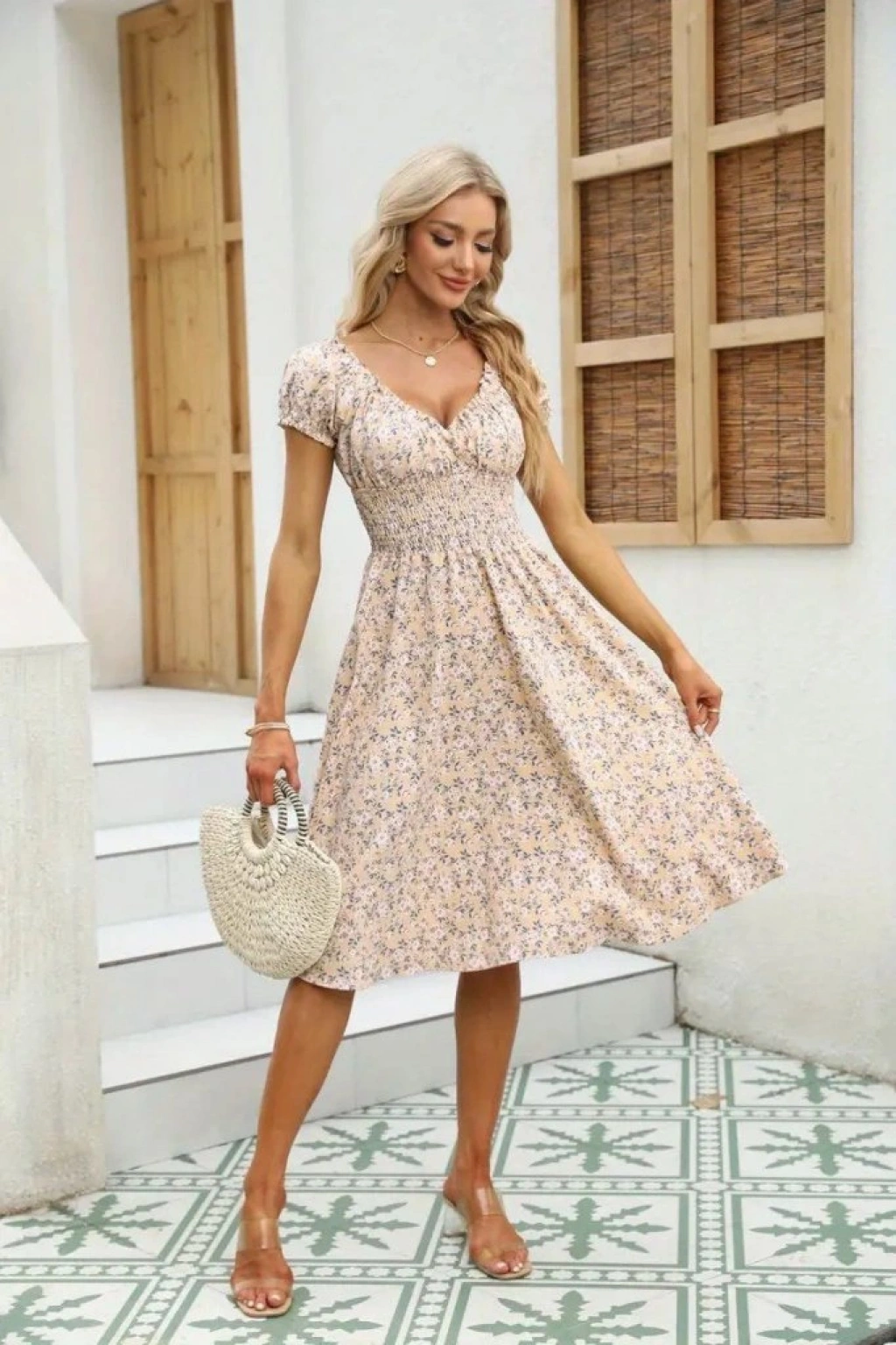 Kadın Kısa Kollu Kruvaze Yaka Lastikli Belden Gipeli çiçek Desenli Suprem Elbise