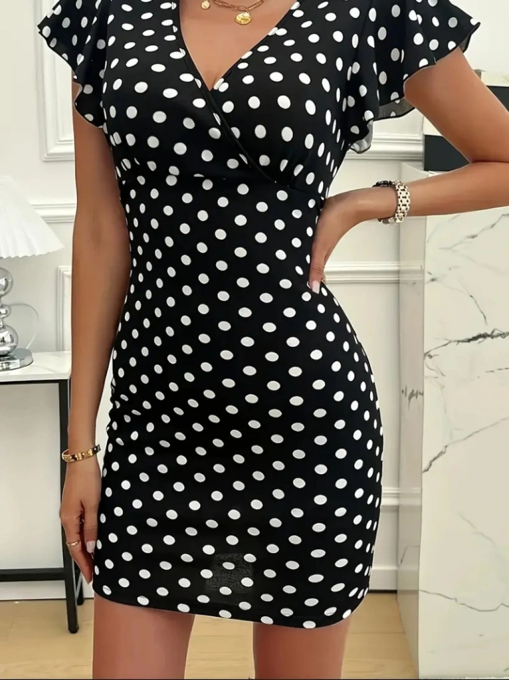 Kadın Kısa Kollu Kruvaze Yakalı örme Puantiyeli Krep Elbise