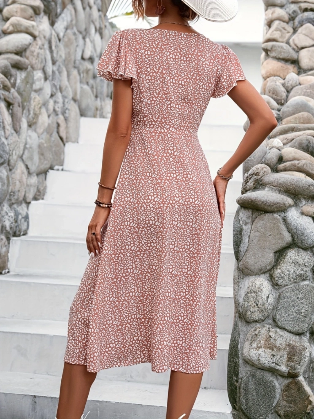 Kadın Kısa Kollu önü Düğmeli Volanlı Minik Leopar Desen Midi Viskon Elbise