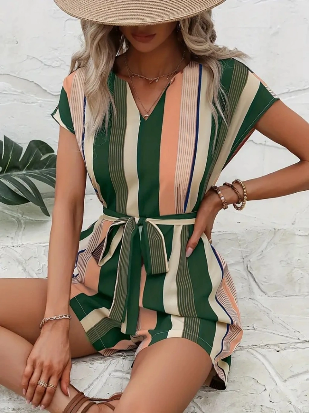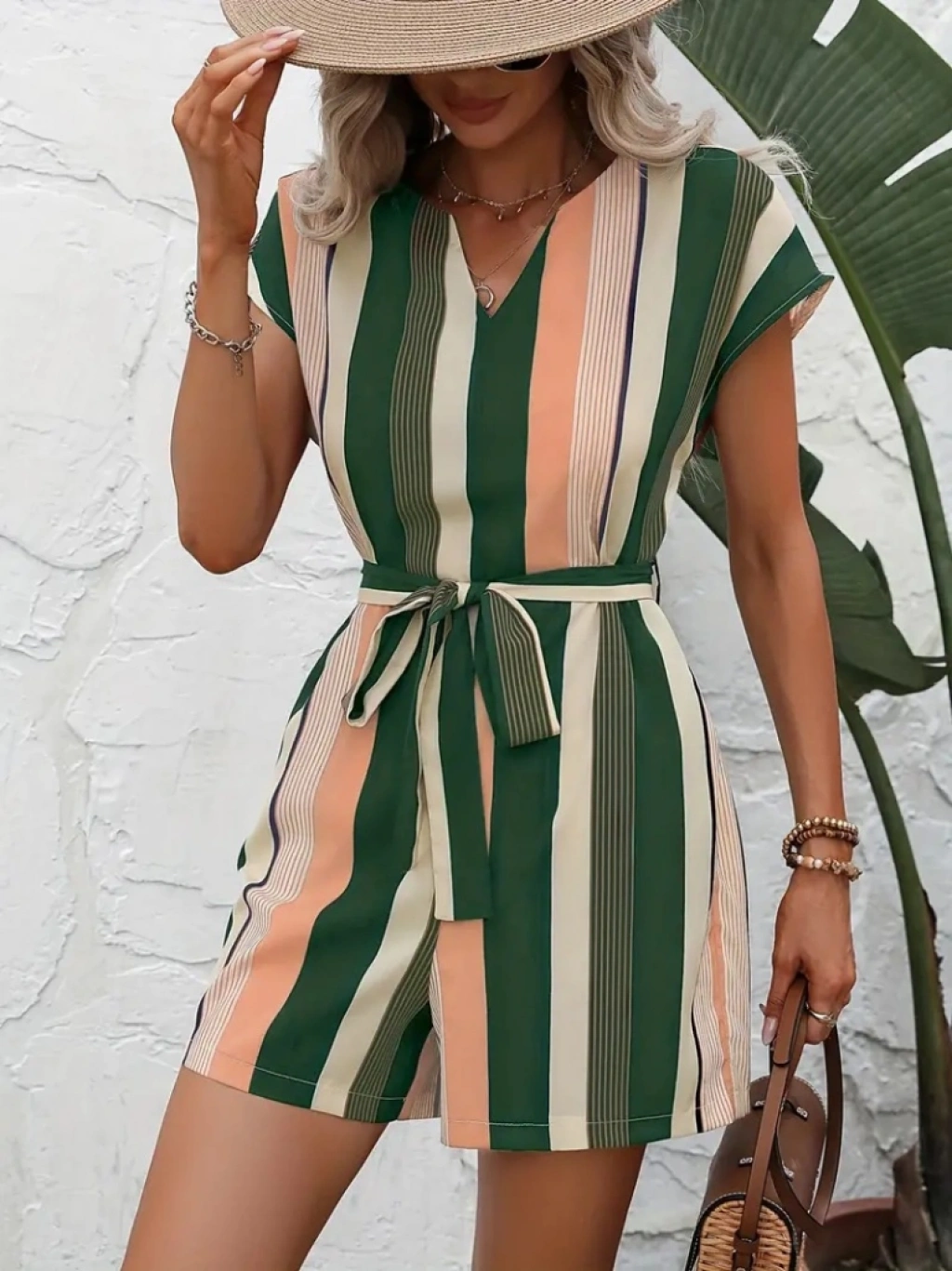Kadın Kısa Kollu V Yakalı Beli Kuşaklı Keten Tulum