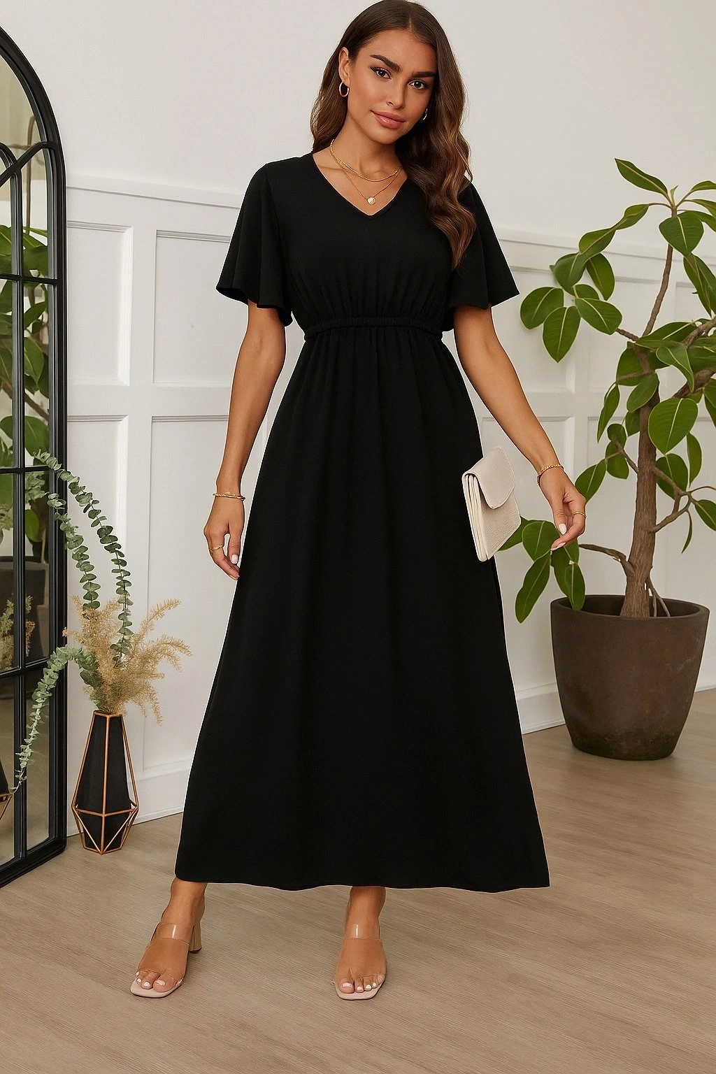 Kadın Kısa Kollu V Yakalı Beli Lastikli Uzun Viskon Elbise
