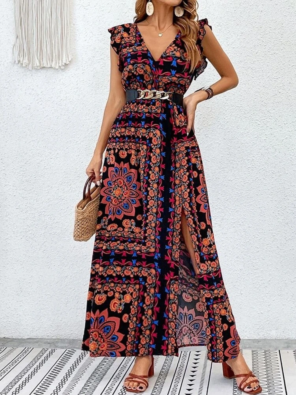 Kadın Kısa Kollu V Yakalı Deseni Yırtmaçlı Süprem Elbise