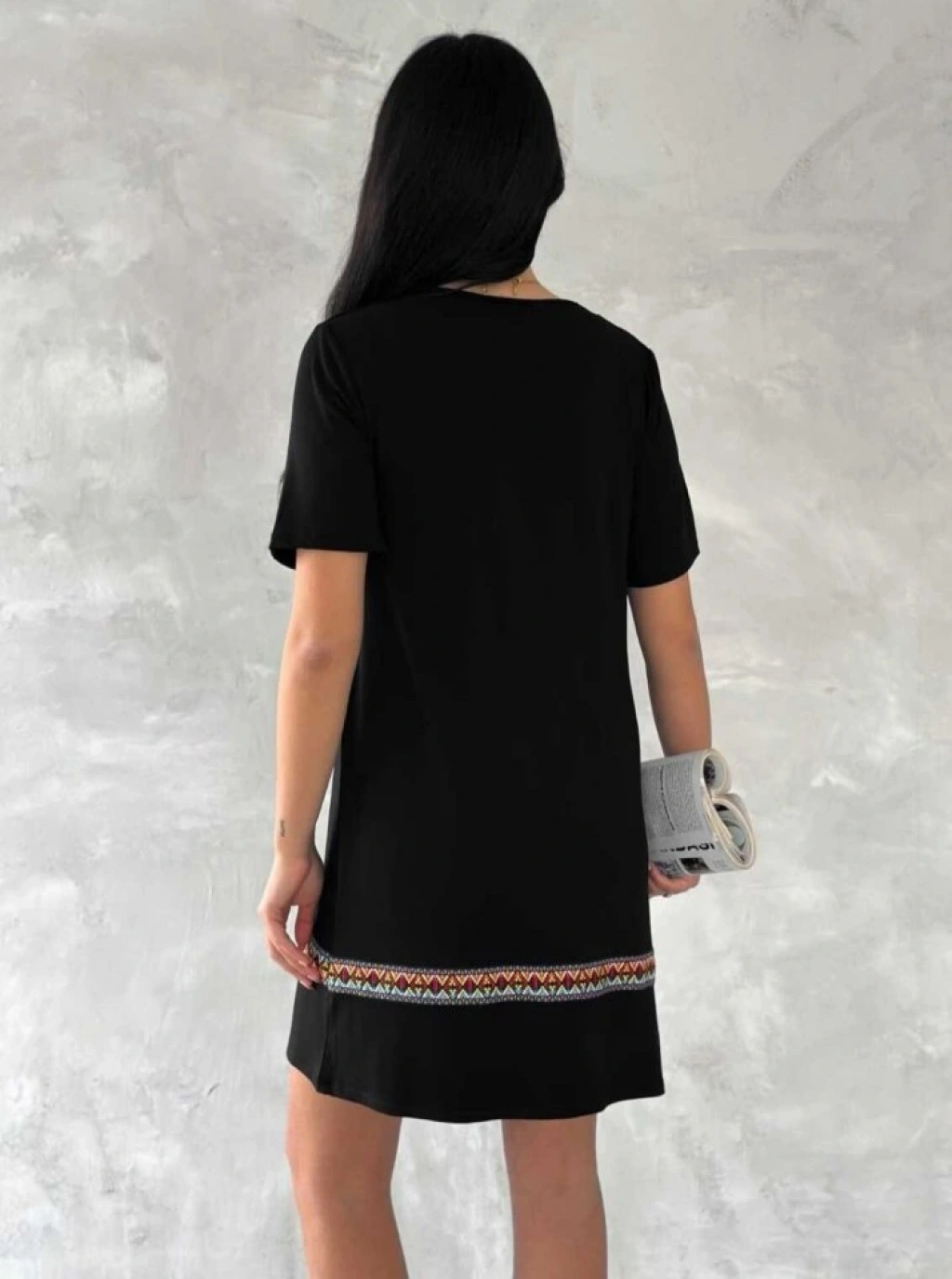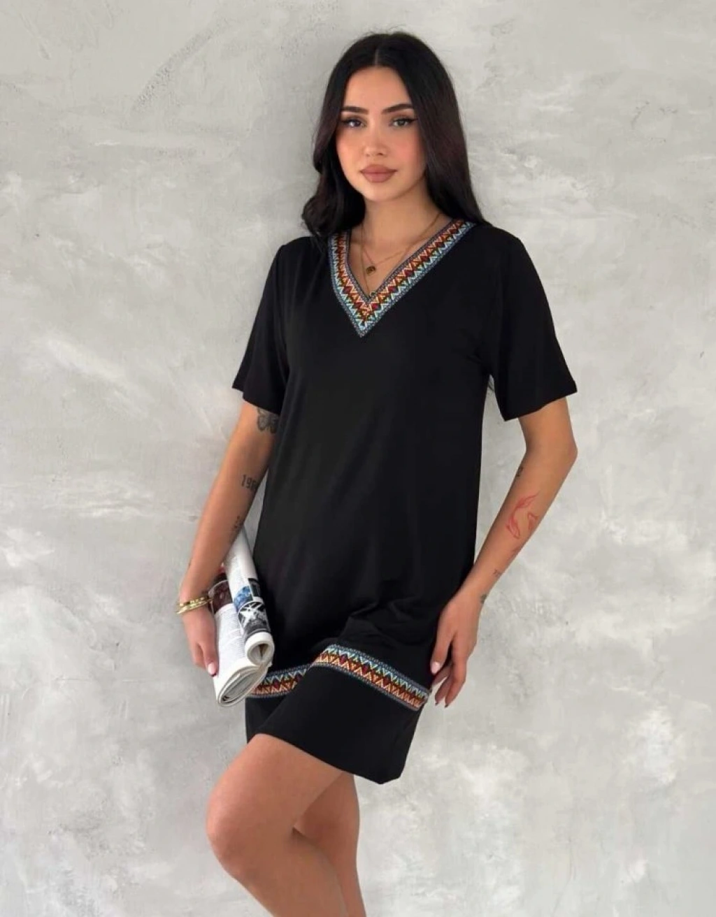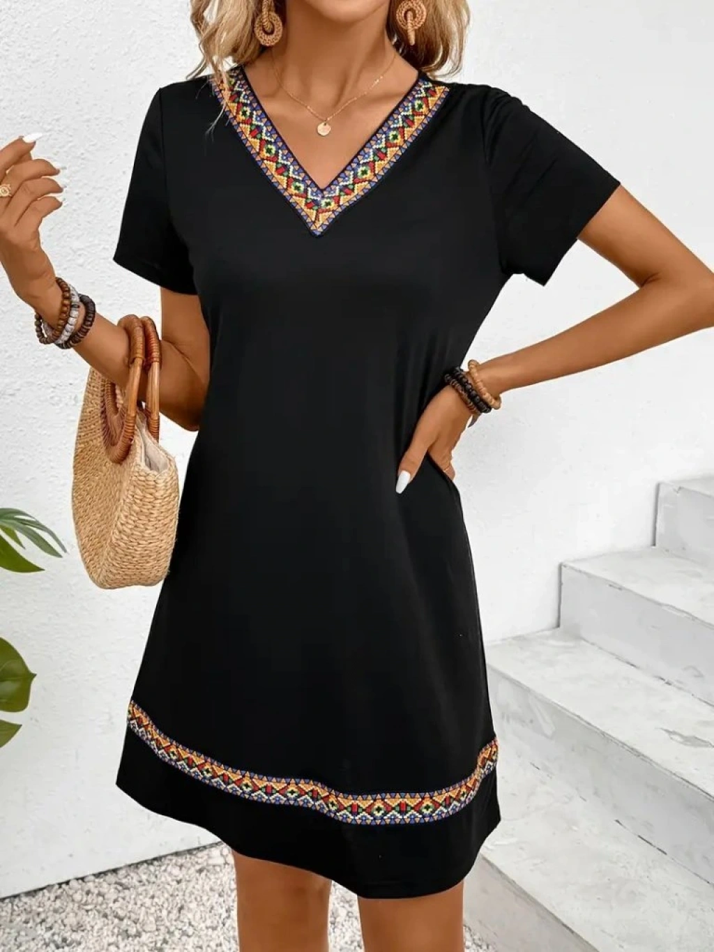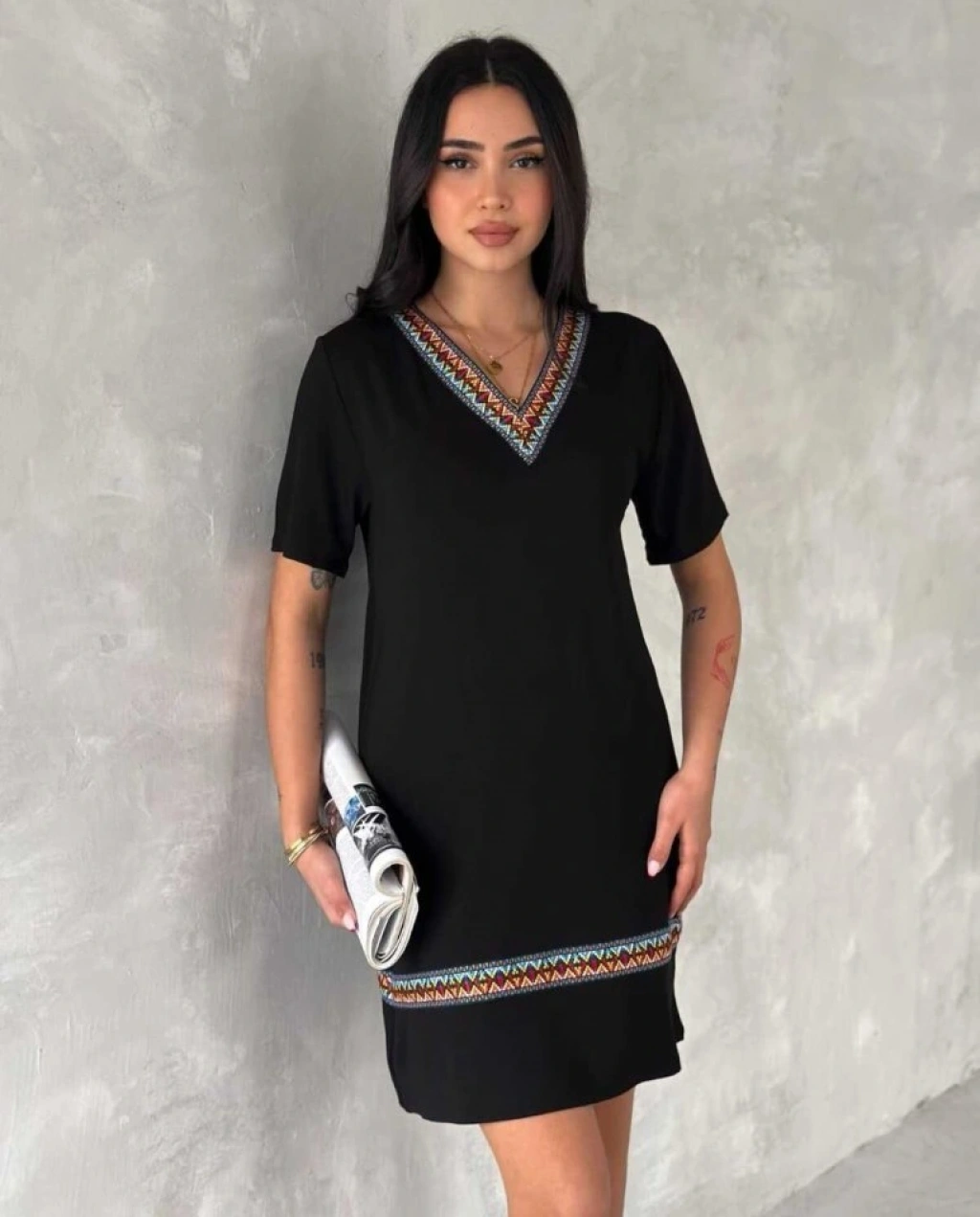 Kadın Kısa Kollu V Yakalı Etnik Desen şerit Detaylı Viskon Elbise