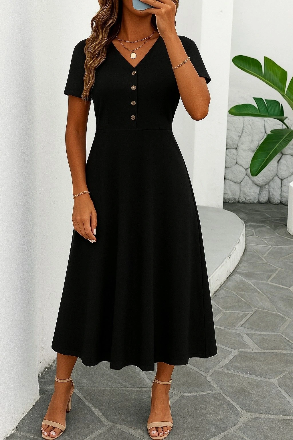 Kadın Kısa Kollu V Yakalı önden Düğmeli Yırtmaçlı Midi Viskon Elbise