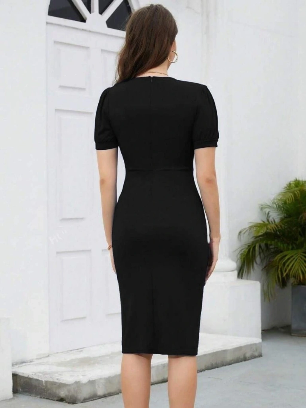 Kadın Kısa Kollu V Yakalı önden Fırfırlı Ithal Krep Elbise
