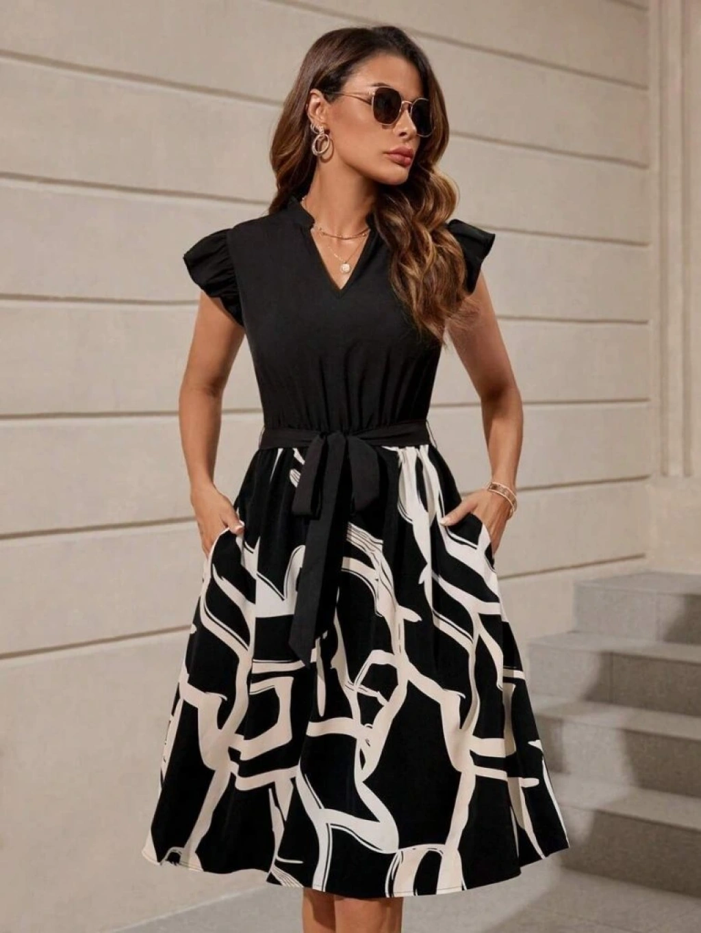 Kadın Kısa Kollu V Yakalı üst Janjan Krep Alt Desenli Süprem Mini Elbise